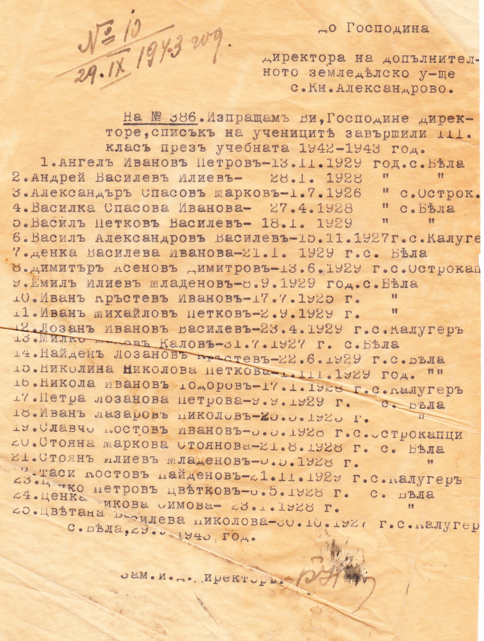 До директора на допълнителното земеделско училище село Княз Александрово. N 386