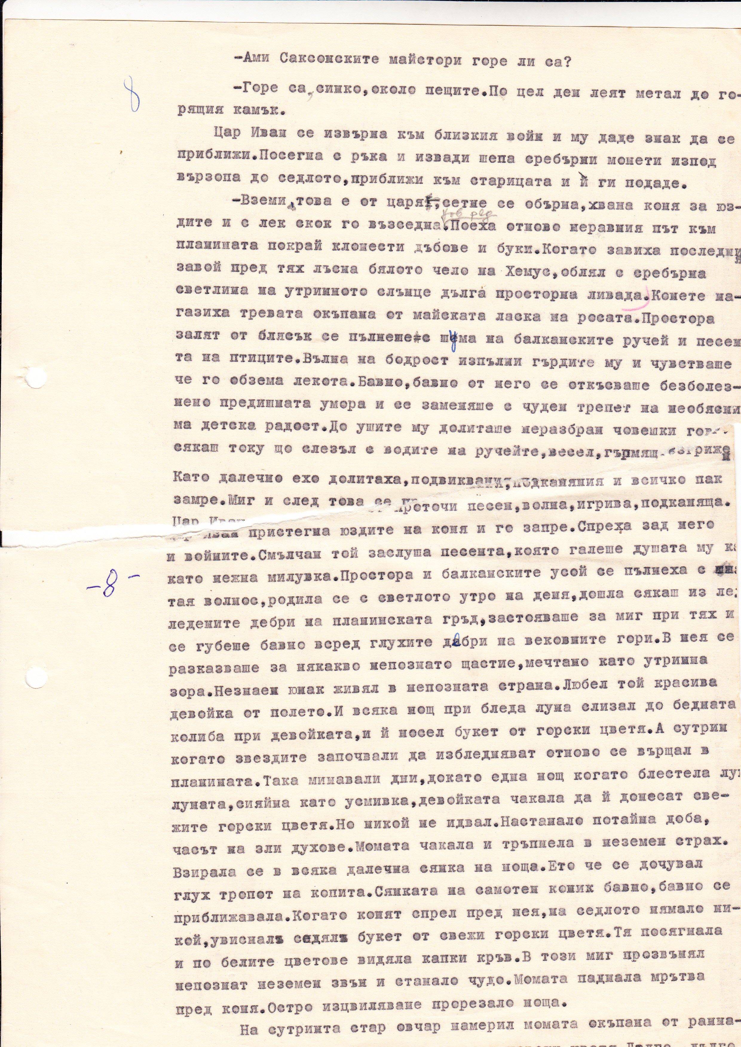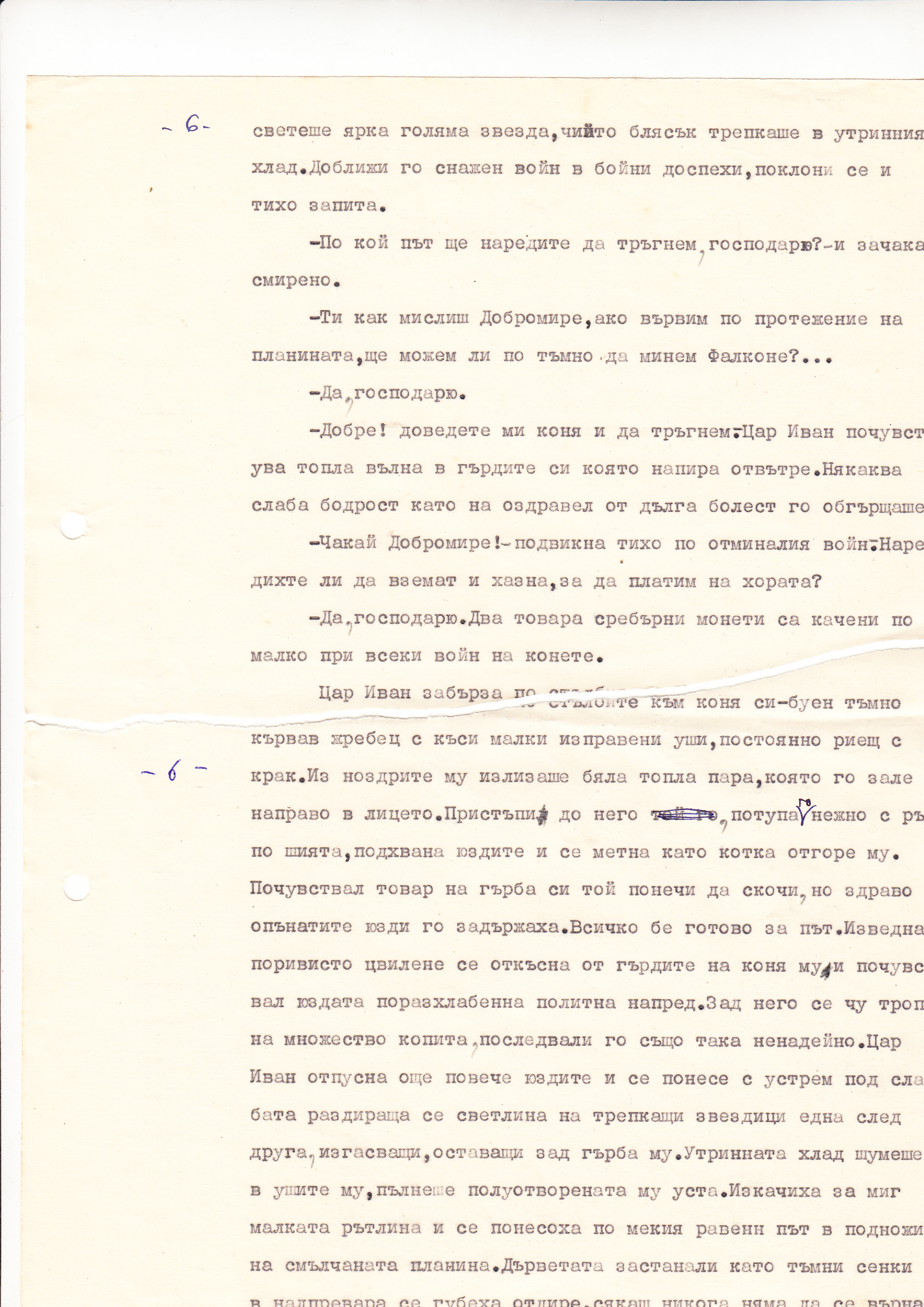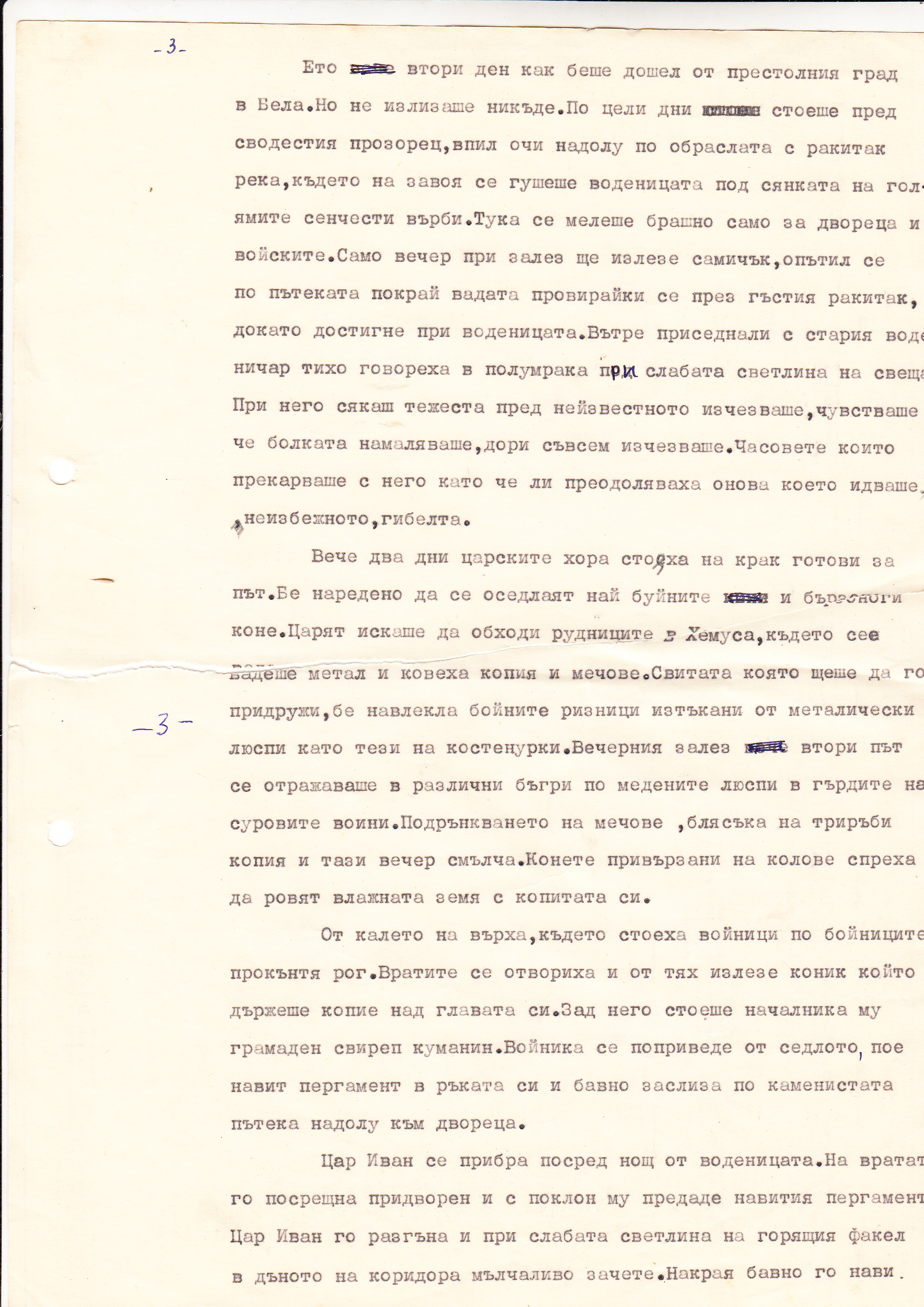 Цар Иван забърза по стълбите към коня си-буен тъмно кървав жребец с къси малки изправени уши, постоянно риещ с крак. Из ноздрите му излизаше бяла топла пара, която го зале направо в лицето. Пристъпи до него, потупа го нежно с ръка по шията, подхвана юздите и се метна, като котка отгоре му. Почуствал товара на гърба си той понечи да скочи, но здраво опънатите юзди го задържаха. Всичко бе готово за път. Изведнъж поривисто цвилене се откъсна от гърдите на коня му и почуствал юздата поразхлабена политна напред. Зад него се чу тропот на множество копита, последвали го също така ненадейно. Цар Иван отпусна още повече юздите и се понесе с устрем под слабата раздираща се светлина на трепкащи звездици една след друга, изгасващи, оставащи зад гърба му. Утринната хлад шумеше в ушите му, пълнеше полуотворената му уста. Изкачиха за миг малката рътлина и се понесоха по мекия равен път в подножието на смълчаната планина. Дърветата зостанали, като тъмни сенки в надпревара се губеха отдире, сякаш никога няма да се върнат.
