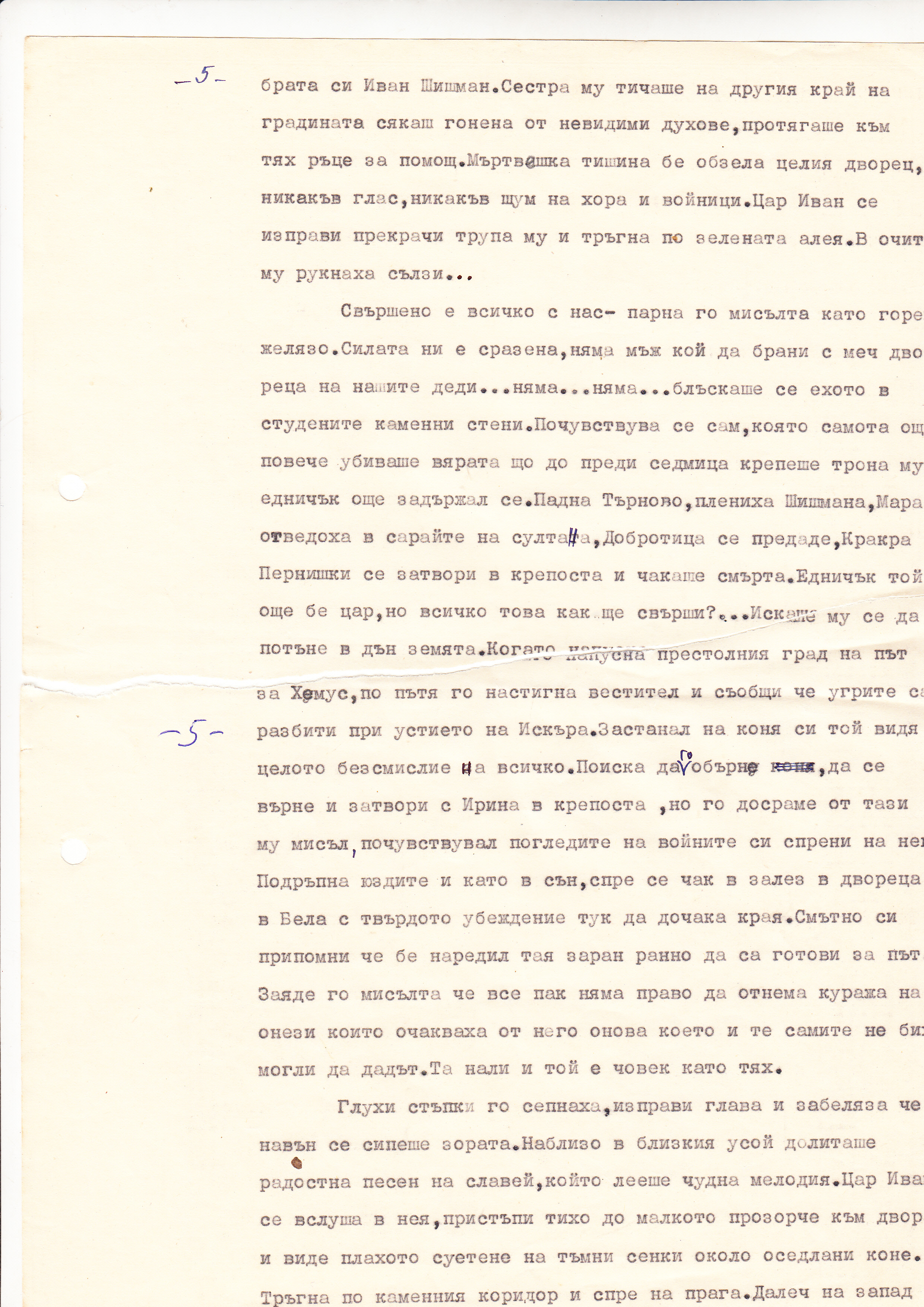 Свършено е всичко с нас- парна го мисълта, като горещо желязо. Силата ни е сразена, няма мъж кой да брани с меч двореца на нашите деди…няма…няма…блъскаше се като ехото в студените каменни стени. Почуствува се сам, която самота още повече убиваше вярата що до преди седмица крепеше трона му, едничък още задържал се. Падна Търново, плениха Шишмана, Мара отведоха в сарайте на султана, Добротица се предаде, Кракра Пернишки се затвори в крепоста и чакаше смърта. Едничък той още бе цар, но всичко това как ще свърши?…Искаше му се да потъне в дън земята. Когато напусна престолния град на път за Хемус, по пътя го настигна вестител и съобщи, че угрите са рзбити при устието на Искъра. Поиска да го обърне, да се върне и затвори с Ирина в крепоста, но го досраме от тази му мисъл, почувствувал погледите на войните си спрени на на него. Подръпна юздите и като в сън, спре се чак в залез в двореца в Бела с твърдото убеждение тук да дочака края. Смътно си припомни, че бе наредил тая заран рано да са готови за път. Заяде го мисълта, че все пак няма право да отнема куража на онези, които очакваха от него онова, което и те самите не биха могли да дадът. Та нали и той е човек като тях.