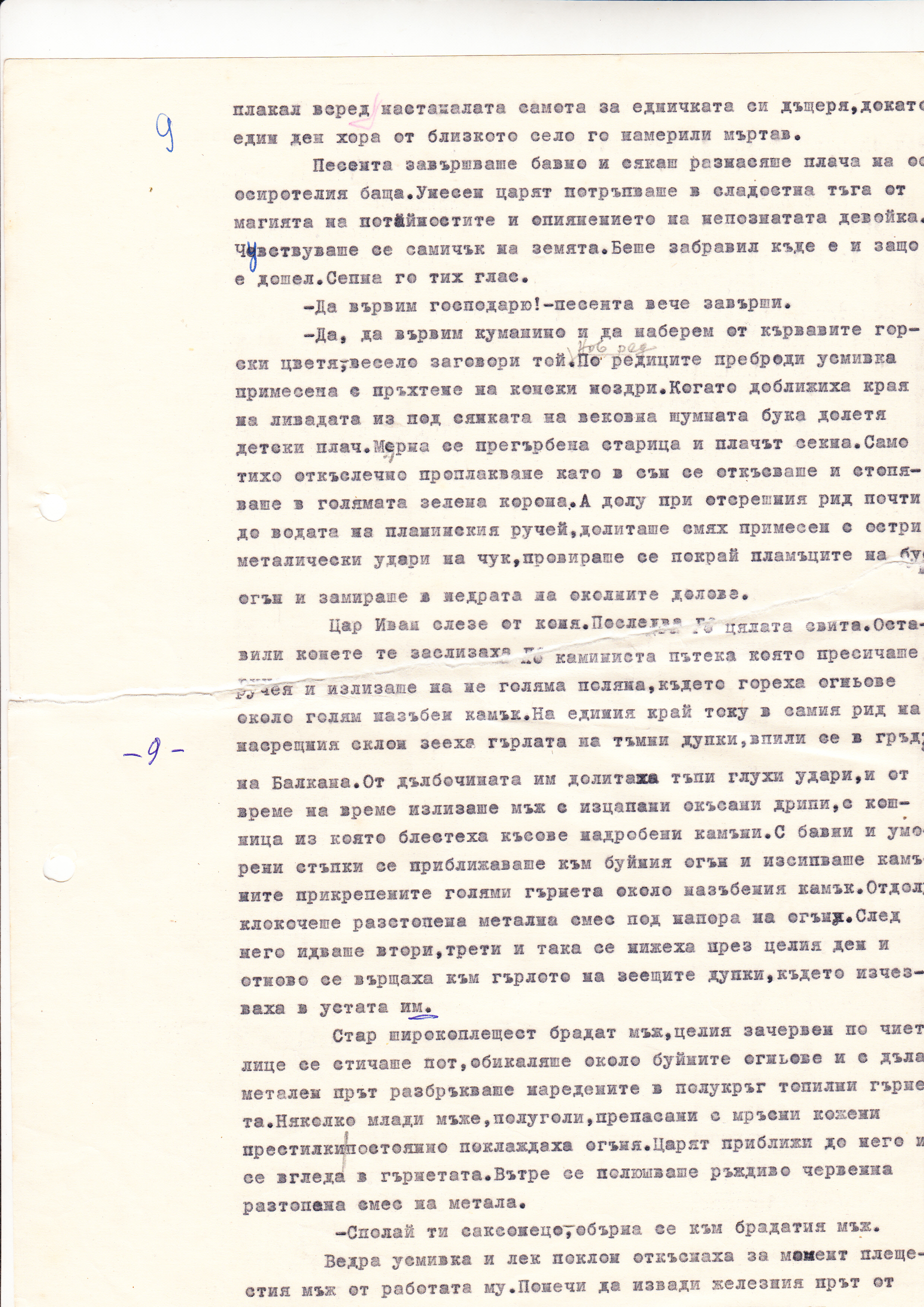По редиците преброди усмивка примесена с пръхтене на конски ноздри. Когато доближиха края на ливадата из под сянката на вековна шумната бука долетя детски плач. Мерна се прегърбена старица и плачът секна. Само тихо откъслечно проплакване, като в сън се откъсваше и стопяваше в голямата в голямата зелена корона. А долу при отсрешния рид почти до водата на планинския ручей, долиташе смях примесен с остри металически удари на чук, провираше се покрай пламъците на буен огън и замираше в недрата на околните долове.