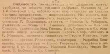 Видинското гимнастическо дружество Бдински юнак, съобщава че годишното събрание състояло се на 1 Ноември т.г. избрало ново настоятелство в следния състав: Председател – подполковник Игнат Илиев
