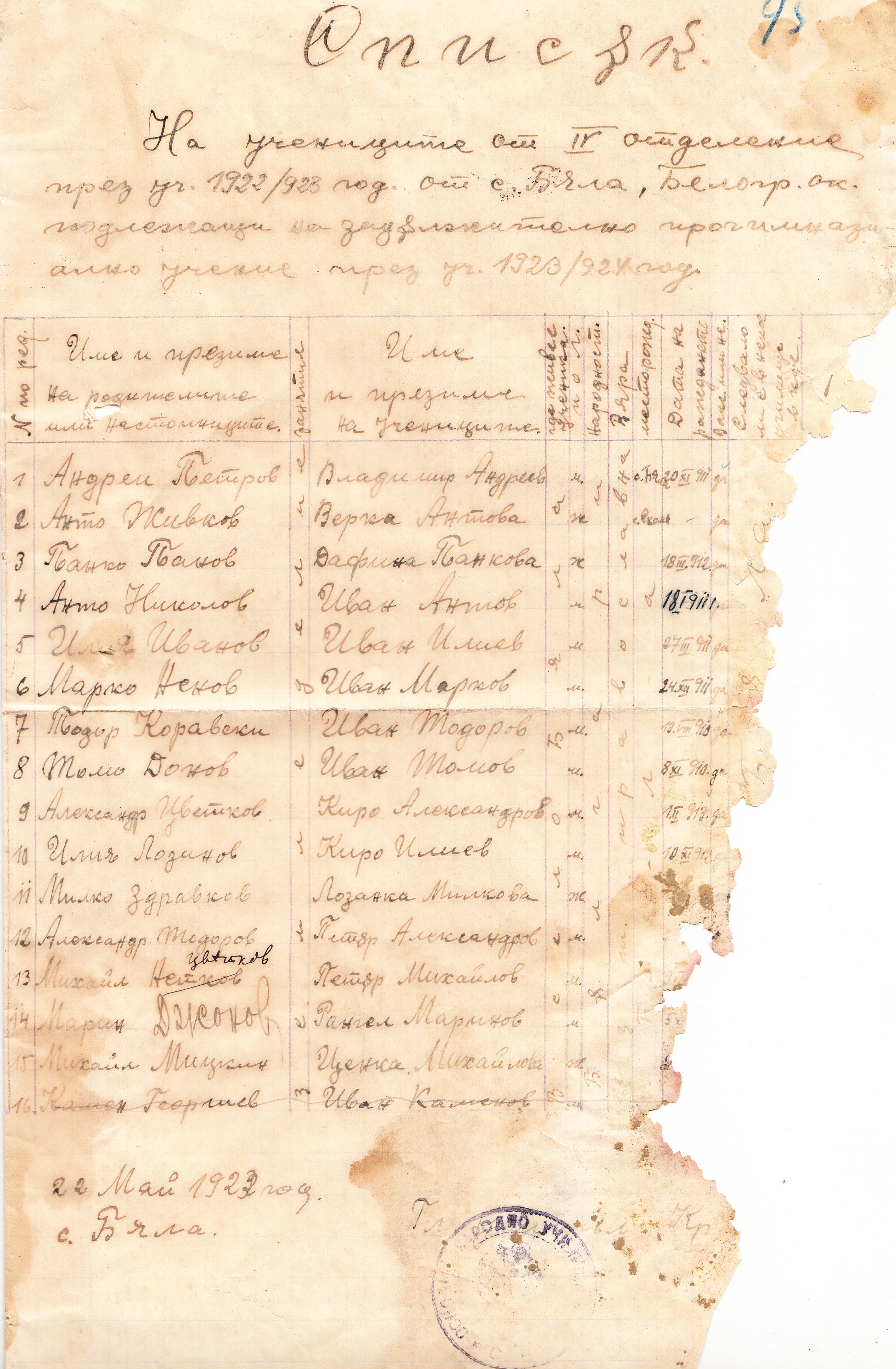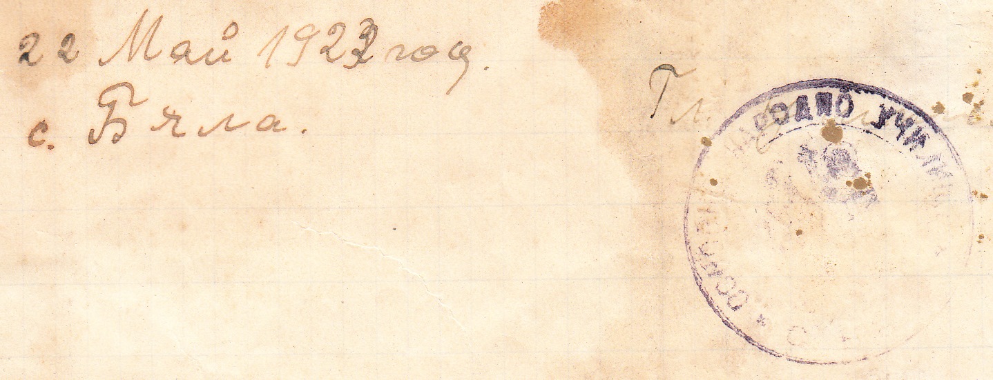 22 Май 1923 год. село Бела, Главен учител /П/ Кр…….