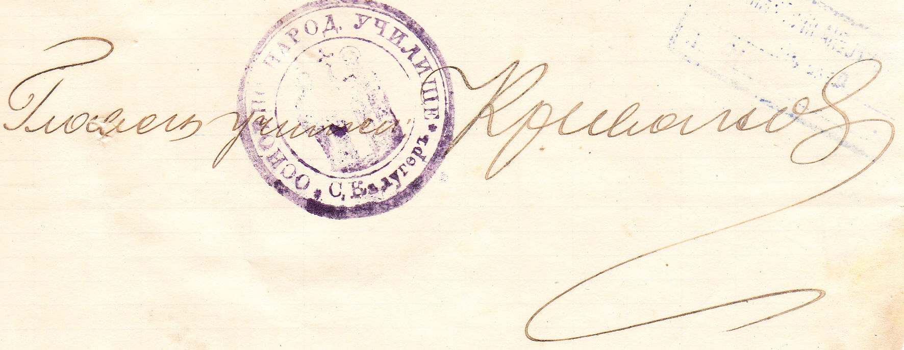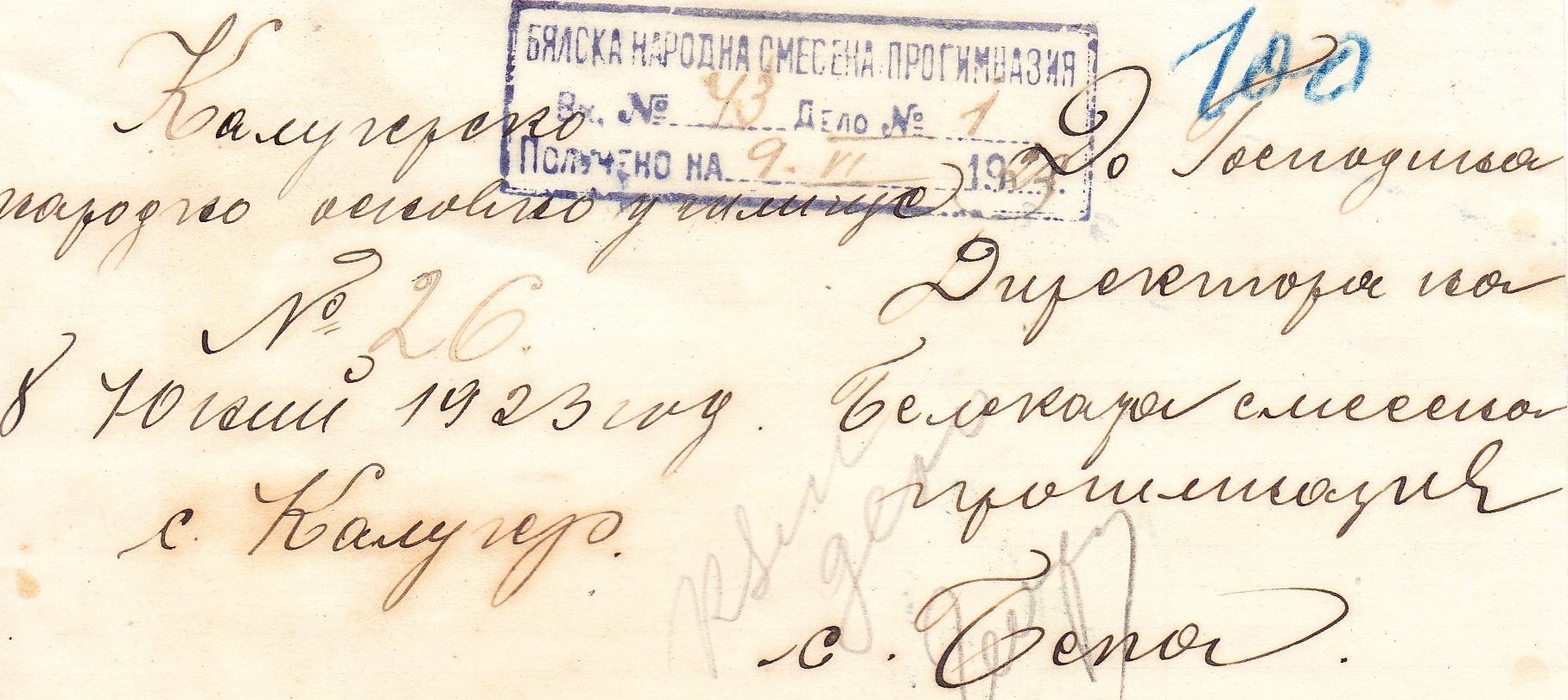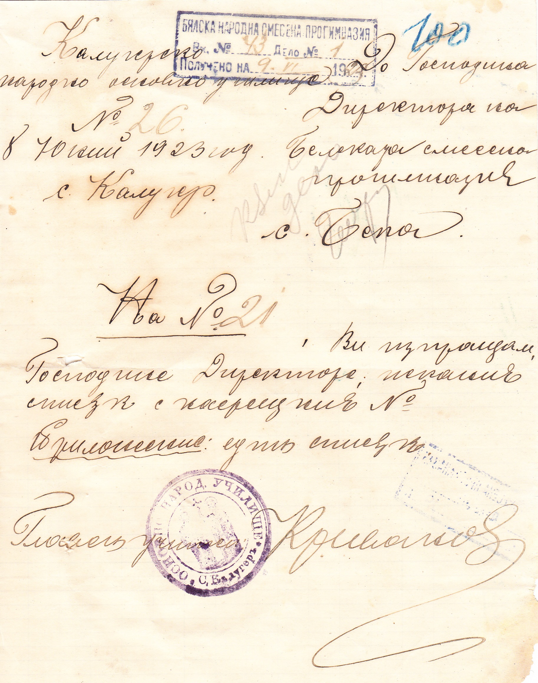 Главен Учител село Калугер 8.Юний 1923 г. /П/ Кръсто Иванов