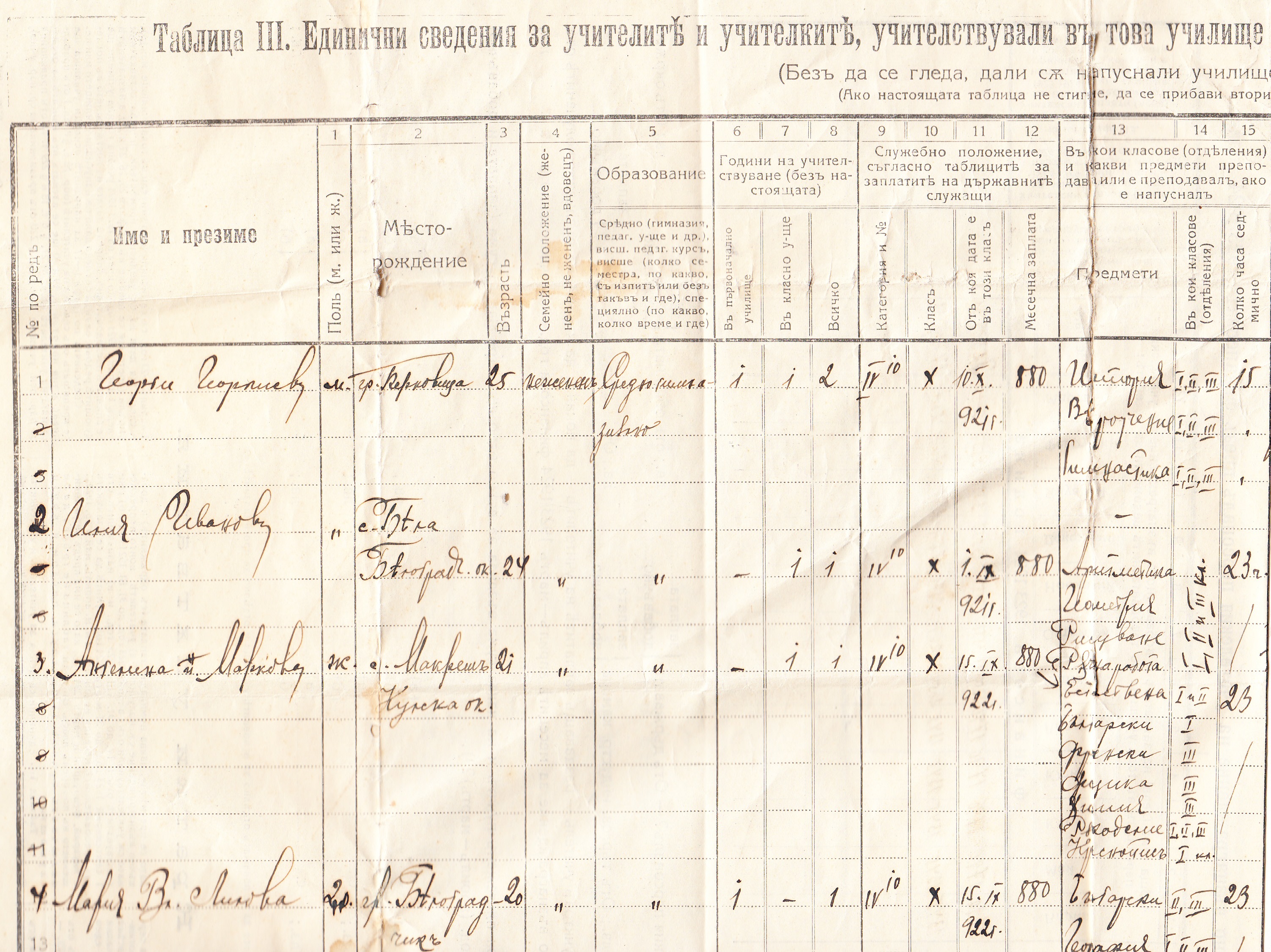 Ангелина поп Маркова, с.Макреш, 21 годишна, средно гимназиално,неженена, 15.09.1922 г., преподава Естествена, Български, Френски, Физика, Химия, Ръкоделие, Краснопис, ….