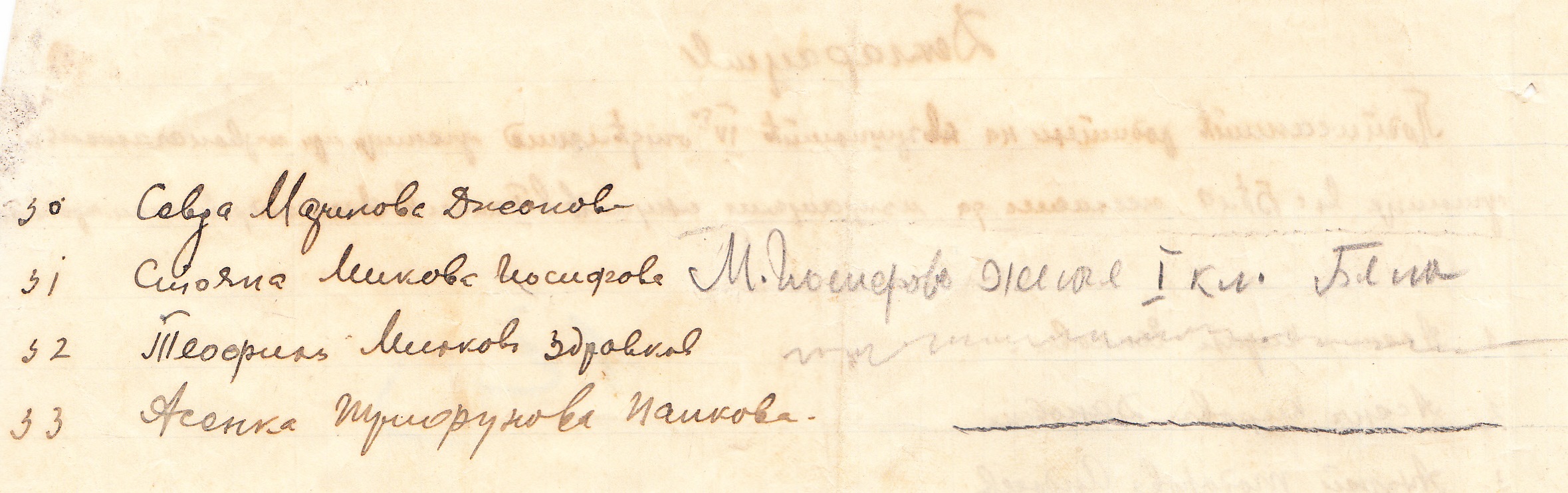 Асен и Кирил Инкови, 2. Асен Киров Дановски, 3. Андрей Тодоров Андреев, 4. Ангелина Василева Паунова, 5. Ангелина Иванова Рангелова, 6. Ангелина Пантова Маркова, 7. Борис Пешов Моцов, 8. Верка Кръстева Иванова, 9. Васил Маринов Василев, 10. Гаврил Петков Василев, 11. Георги Петров Георгиев, 12. Георги Стоянов Георгиев, 13. Георги Тодоров Панов, 14. Елисавета Иванова Цандова, 15. Йордана Иванова Антова, 16. Илия Вълков Цоков, 17. Иван Христов Василев, 18. Крум Джурджов Андреев, 19. Мария Василева Пешова, 20. Мария Йосифова Панова, 21. Младена Илиева Младенова, 22. Матей Алексов Митов, 23. Мито Матеев Киров, 24. Надежда Лозанова Георгиева, 25. Найден Костадинов Каменов, 26. Найден Михайлов Иванов, 27. Петко Алексов Петков, 28. Пано Томов Георгиев, 29. Петра Пешова Иванова, 30. Райна Николова Иванова,31. Севда Маринова Джонова, 32. Стояна Микова Йосифова, 33. Теофил Миков Здравков, 34. Асенка Трифунова Панкова.