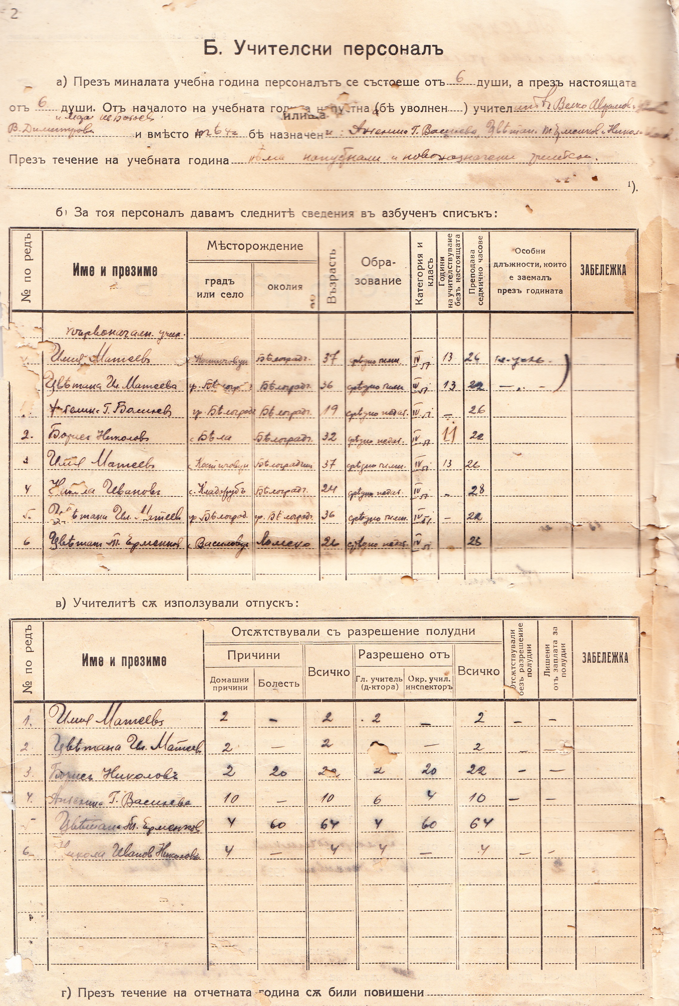 През миналата учебна година персоналът се състоеше от 6 души. От началото на учебната гина напуснаха: Велко Аврамов, Цветана В.Димитрова и Мара Ив. Богоева и бяха назначени: Ангелина Г. Василева, Цветан Т. Ерменков и Никола Иванов.