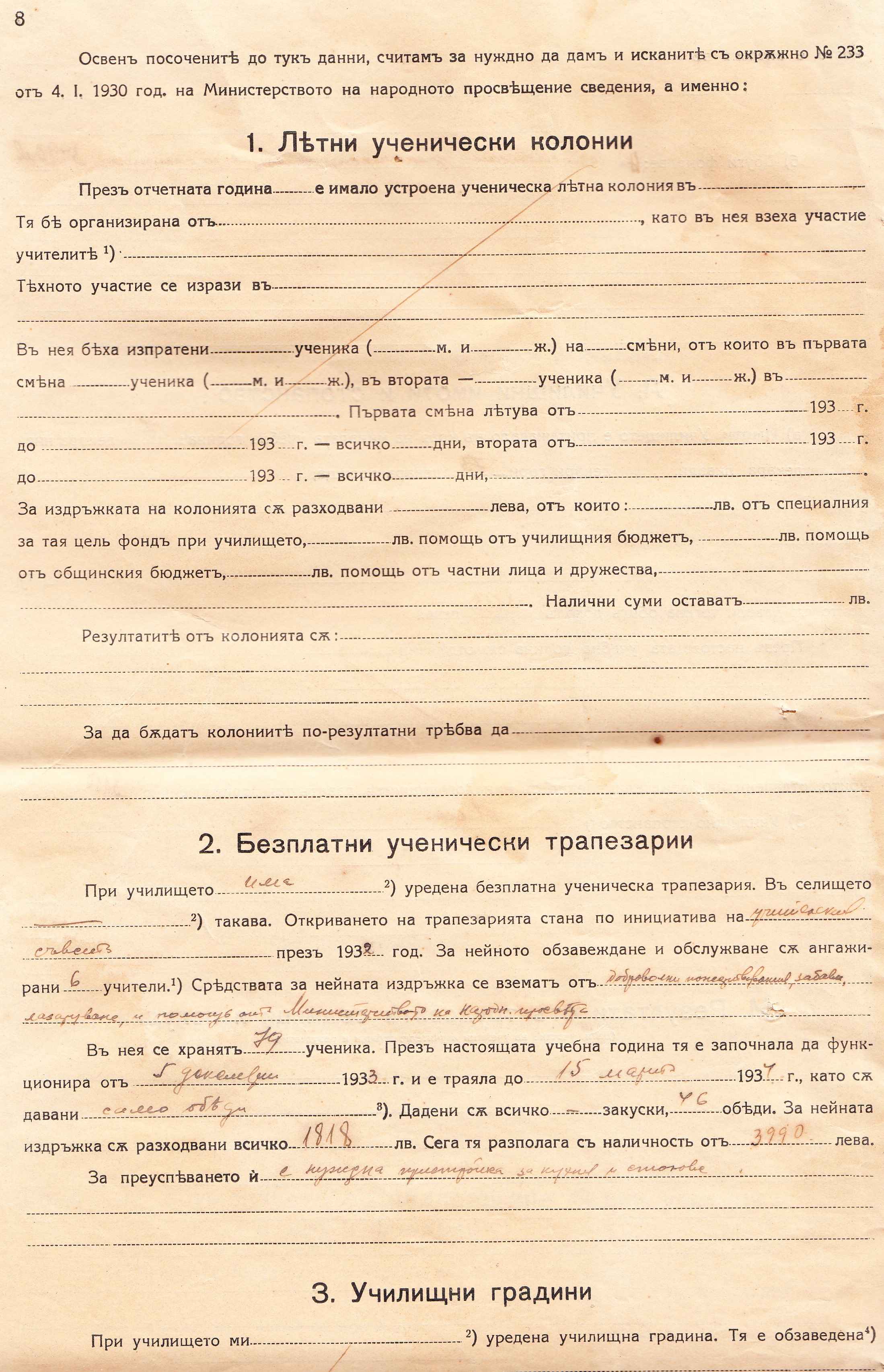 Трапезарията е давала обеди средно на 70 ученика от 5.12.1933 г. до 15.03.1934 г. През това време са дадени 46 обеда на стойност 1818 лв.