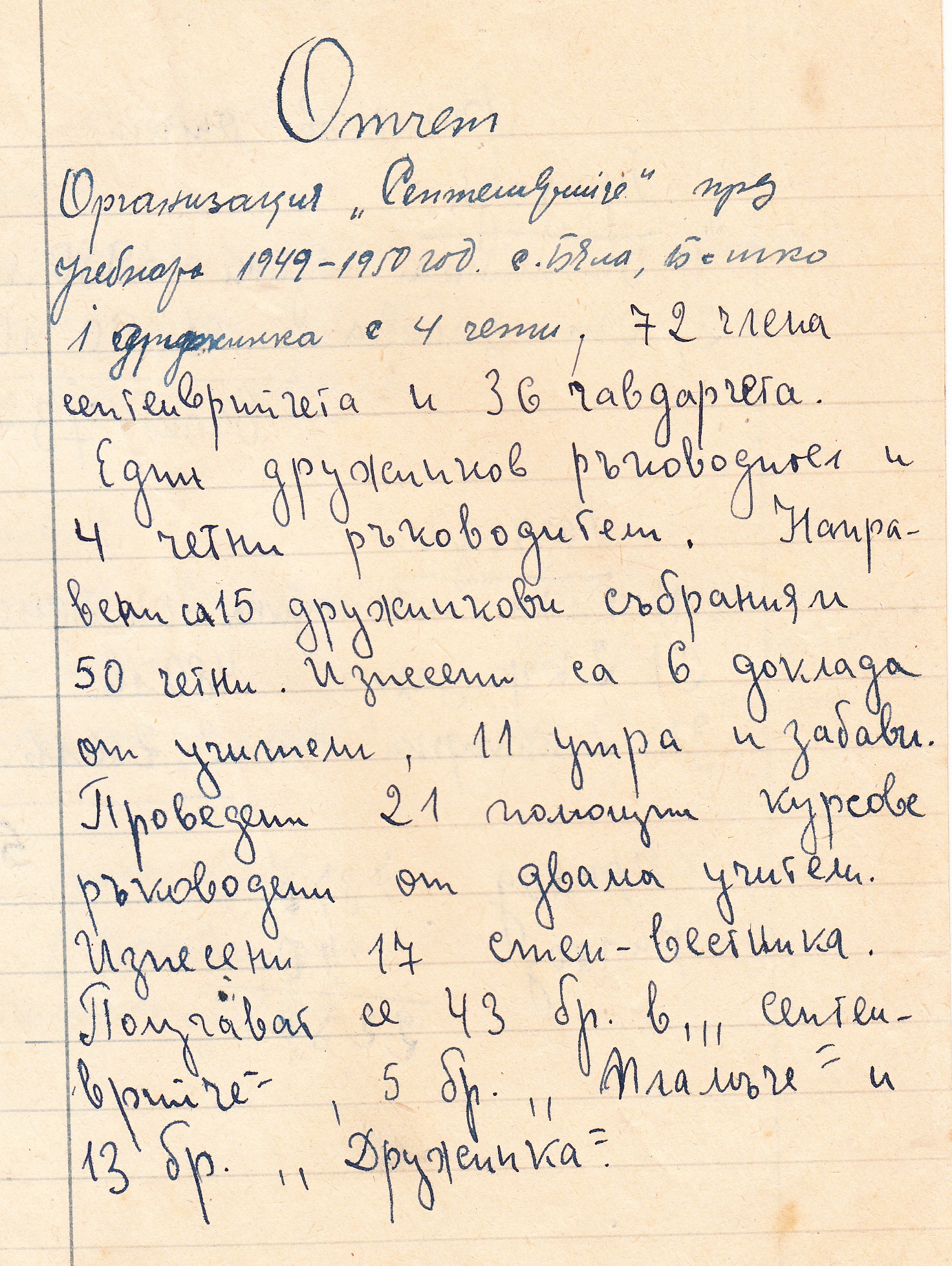 Организацията се състои от 1 дружинка с 4 чети , 72 члена Септемврийчета и 36 Чавдарчета. Един дружинен ръководител и 4 четни ръководители. Направени са 15 дружинкови събрания и 50 четни. Изнесени са 6 доклада от учители , 11 утра и забави. Проведени 21 помощни курсове , ръководени от двама учители. Изнесени 17 стен-вестника. Получават се 43 бр. в.“Септемврийче“, 5 бр. „Пламъче“ и 13 бр. „Дружинка“.