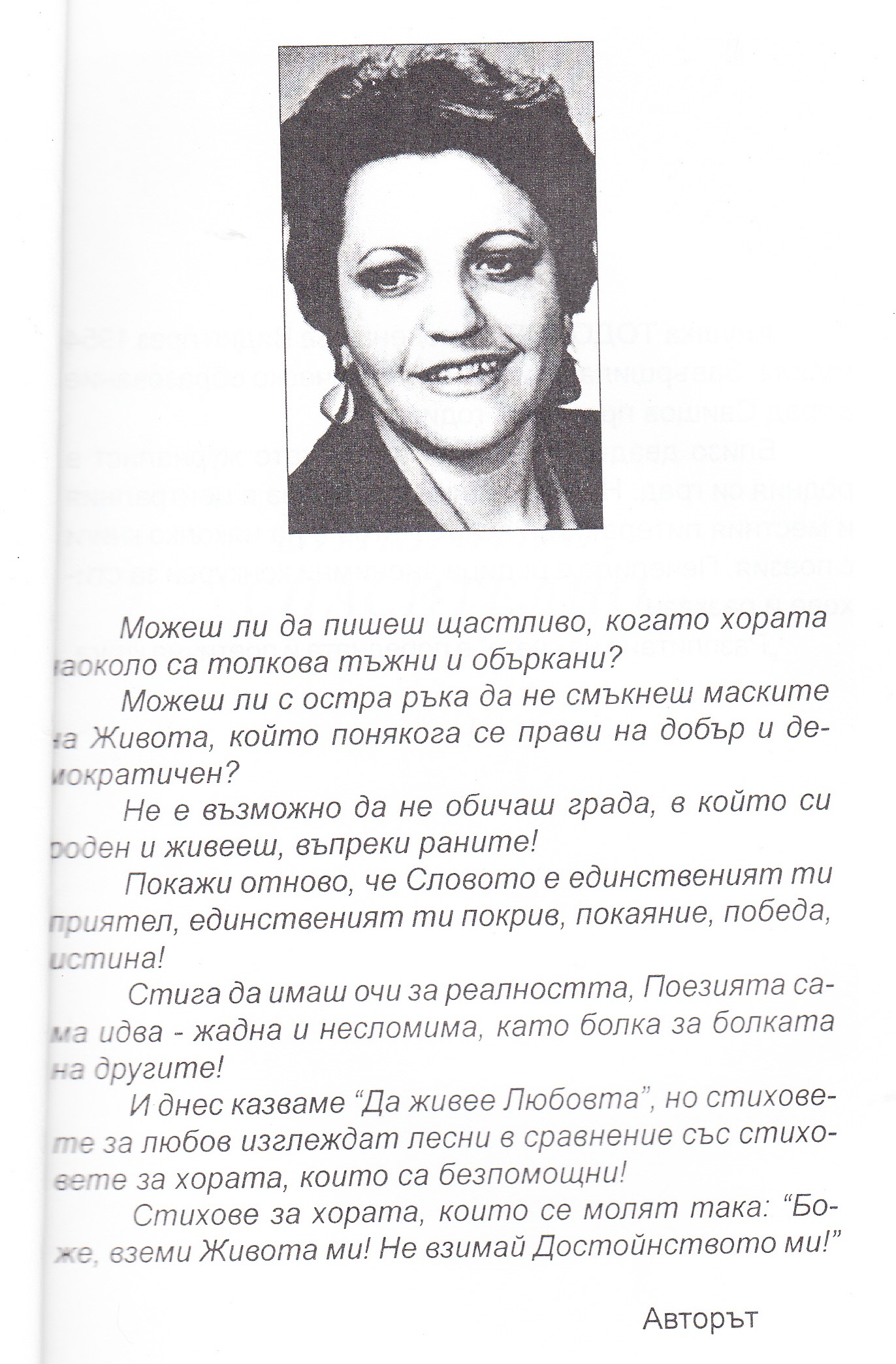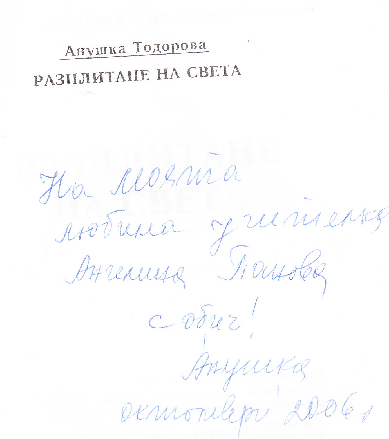 „На моята любима учителка Ангелина Панова с обич. /П/ Анушка , Октомври 2006 г.“