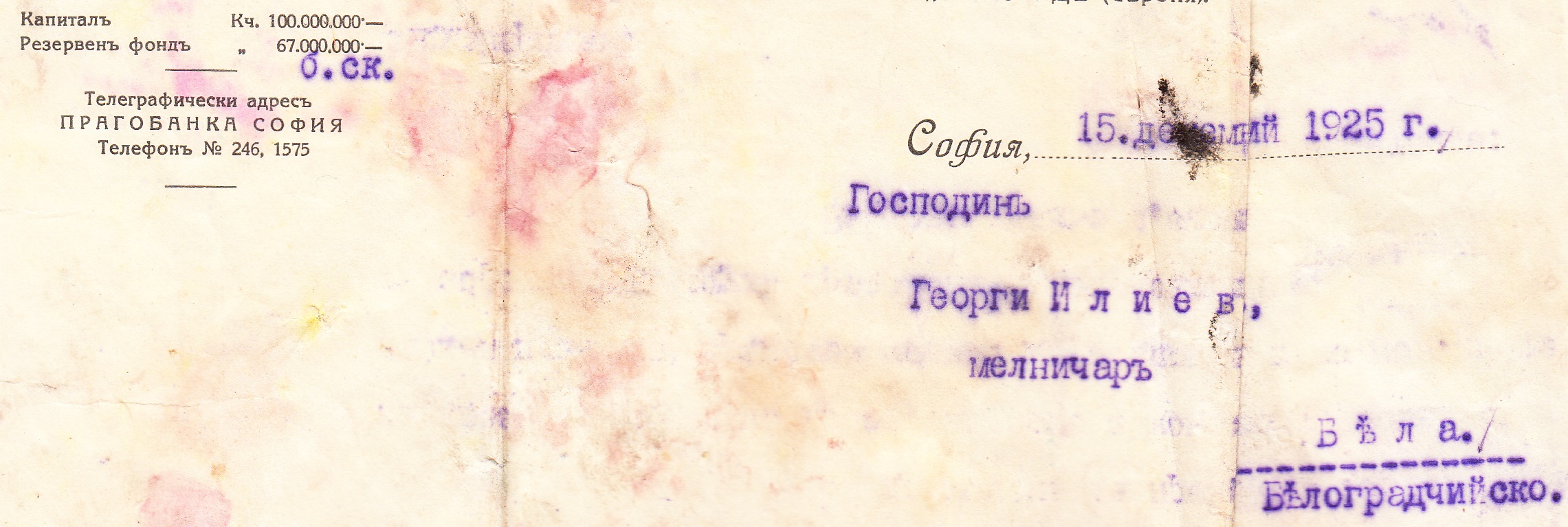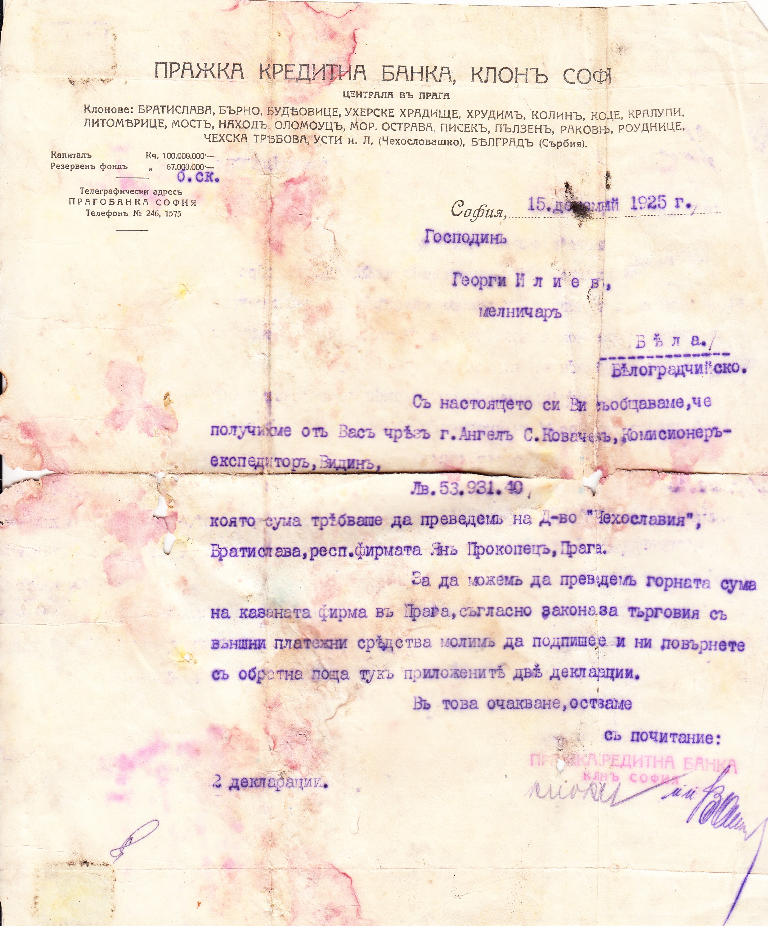 Чрез г-н Ангел С. Ковачев, комисионер – експедитор от гр. Видин, да се преведе на Дружество „Чехославия“ Братислава, респективно ф-та на Ян Прокопец – Прага.