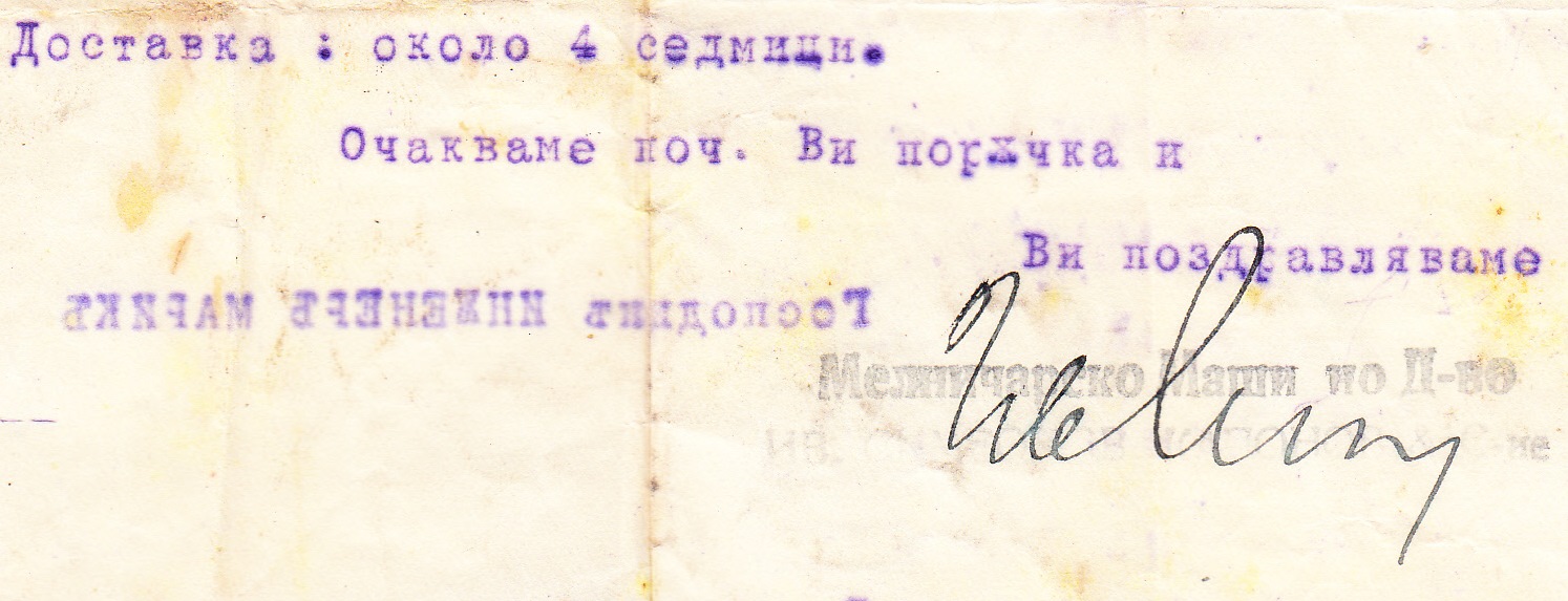 Един документ от Мелничарско Машинно Дружество „Ив. Симеонов, Капонов и С-ие“ – Плевен до инжинер Марек – Видин.
