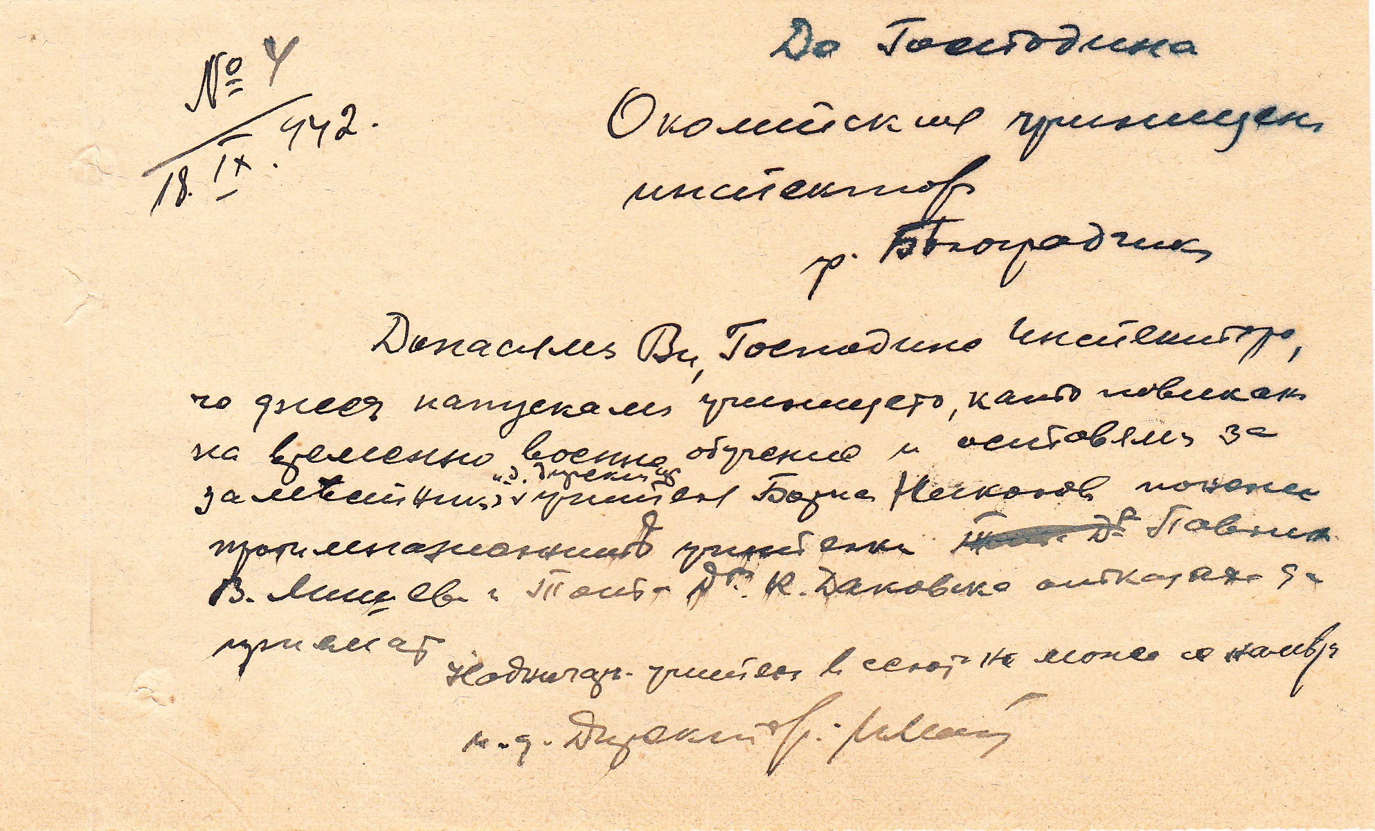 и.д. Директора на Белското училище г-н Илия Матеев донася, че е повикан на временно военно обучение и остава за заместник и.д. Директор учителя Борис Николов , поканените от него /да заемат длъжността/ прогимназиални учителки – Павлина М.Мишева и Тота Д-р К. Даковска отказват да приемат длъжността.