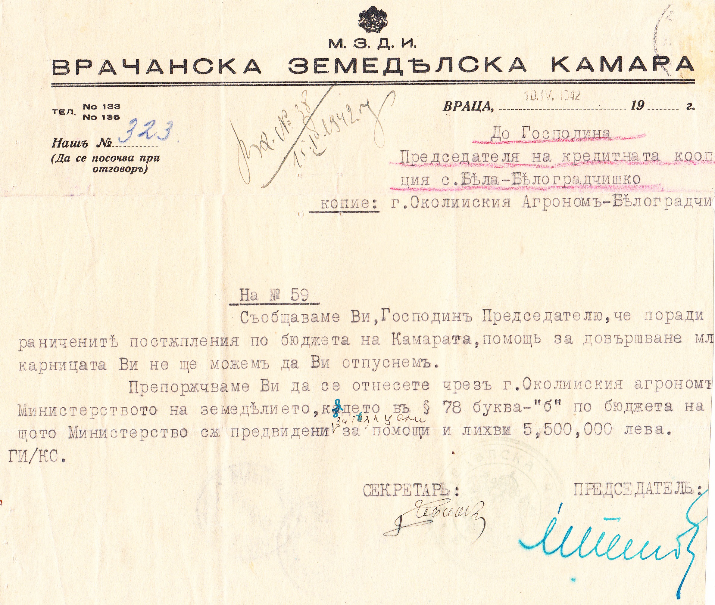 Отказване на помощ от „ВРАЧАНСКА ЗЕМЕДЕЛСКА КАМАРА“ N 323 /15.04.1942 г. за довършване на млекарницата в село Бела.
