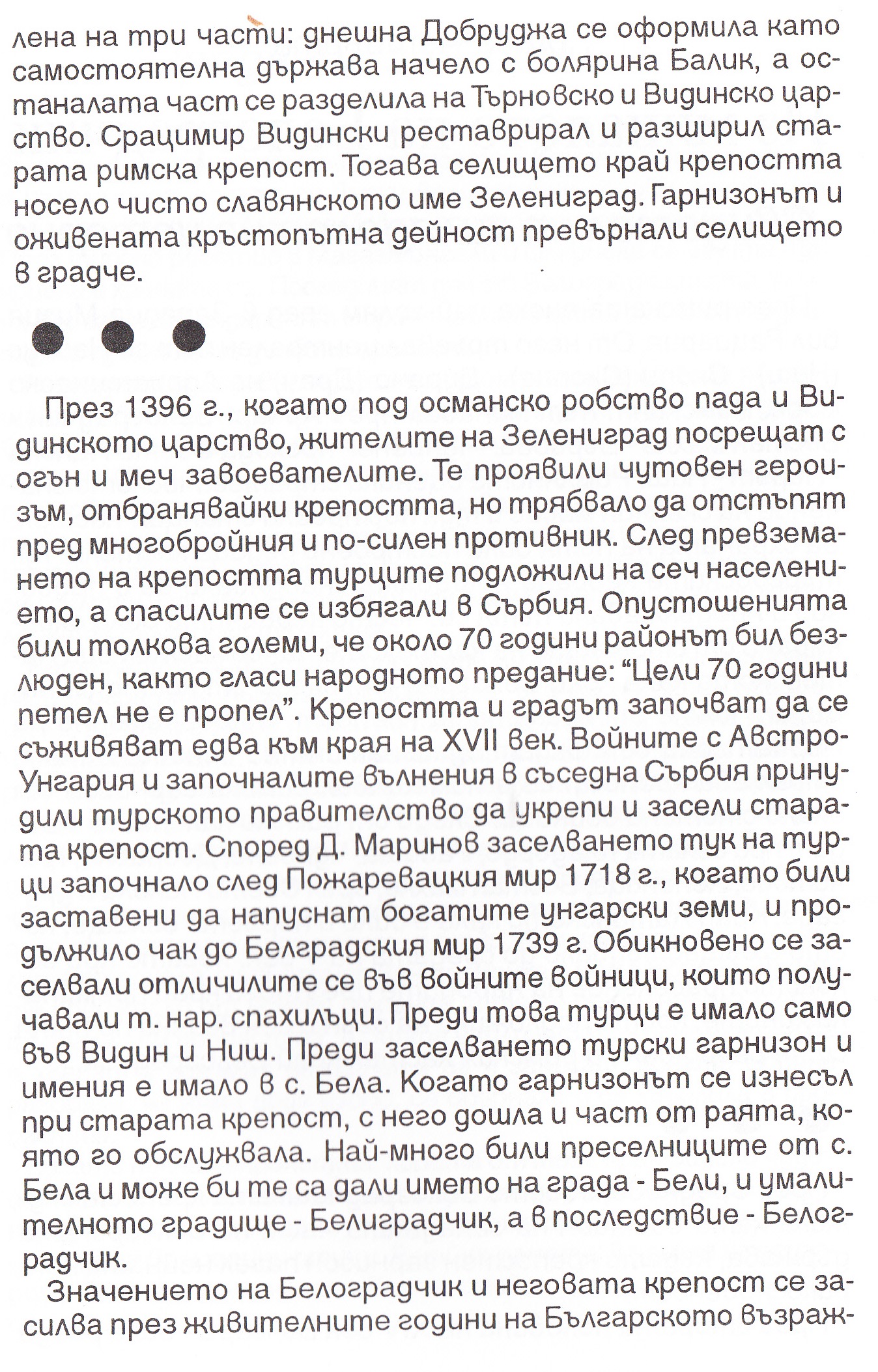 …..“ Според Димитър Маринов / Димитър Маринов Бонев 1846-1940 г./ заселването тук на турци станало след Пожаревацкия мир 1718 год. , когато били заставени да напуснат богатите Унгарски земи, и продължило чак до Белградския мир 1739 год. Обикновено се заселвали отличилите се във войните войници, които получавали т.нар. спахилъци. Преди това турци е имало само във Видин и Ниш. Преди заселването турски гарнизон и имения е имало в с.Бела. Когато гарнизонът се изнесъл при старата крепост, с него дошла и част от раята, която го обслужвала. Най-много били преселниците от село Бела и може би те са дали името на града – Бели, и умалителното градище – Белиградчик, а в последствие – Белоградчик….“
