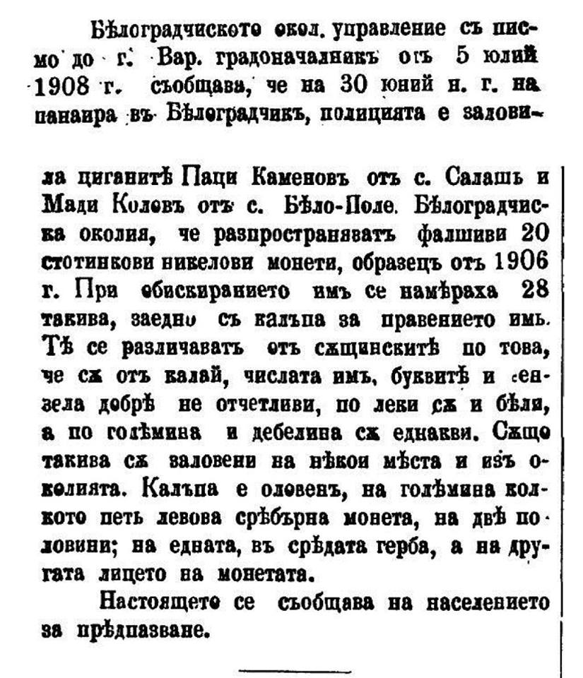 „….30 Юни 1908 година на Панаира в гр.Белоградчик, полицията е заловила Паци Каменов от с.Салаш и Мади Калов от с. Бело-поле, че разпространяват фалшиви монети / 20 стотинки никелови обр. 1906 година заедно с калъпа за правенето им……“