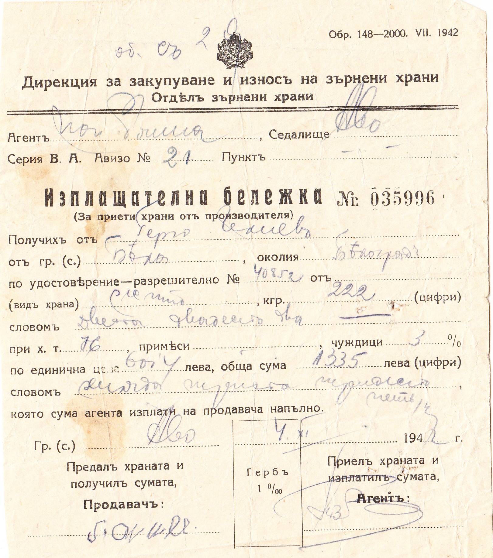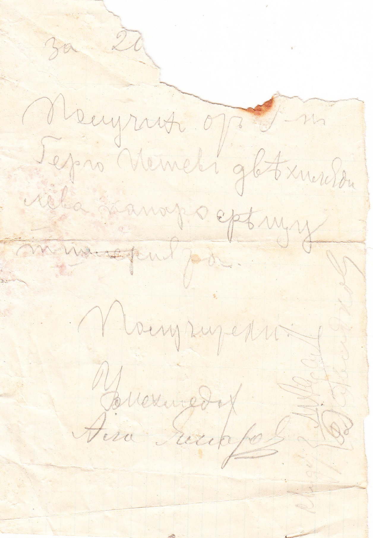 Разписка за получаване на един екземпляр препис от договор за продажба на част от воденицата, закупена от Герго Илиев.
