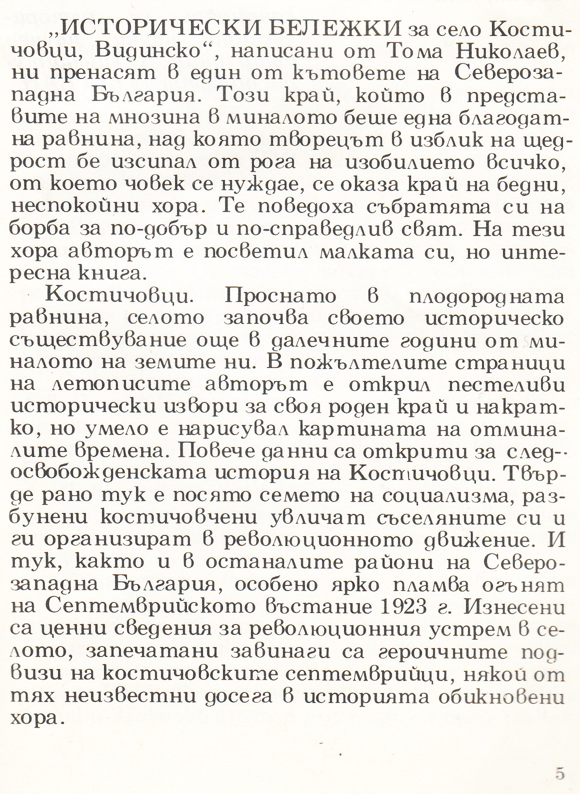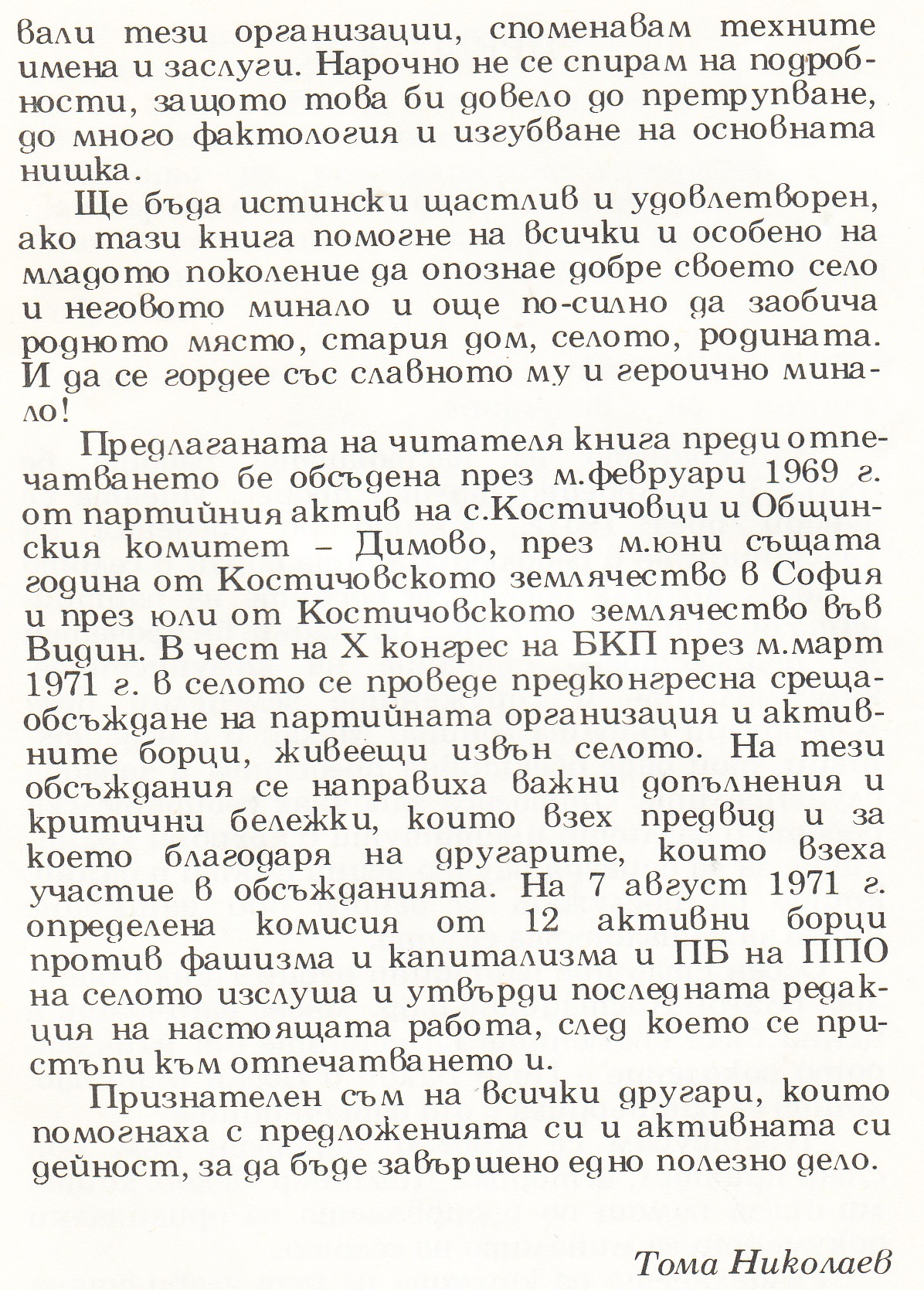 През 1973 година Тома Николаев издава книгата “ Исторически бележки за село Костичовци-Видинско“ където в глава втора „Политически живот на селото“ описва подготовката и провеждане на Септемврийското въстание 1923 година.