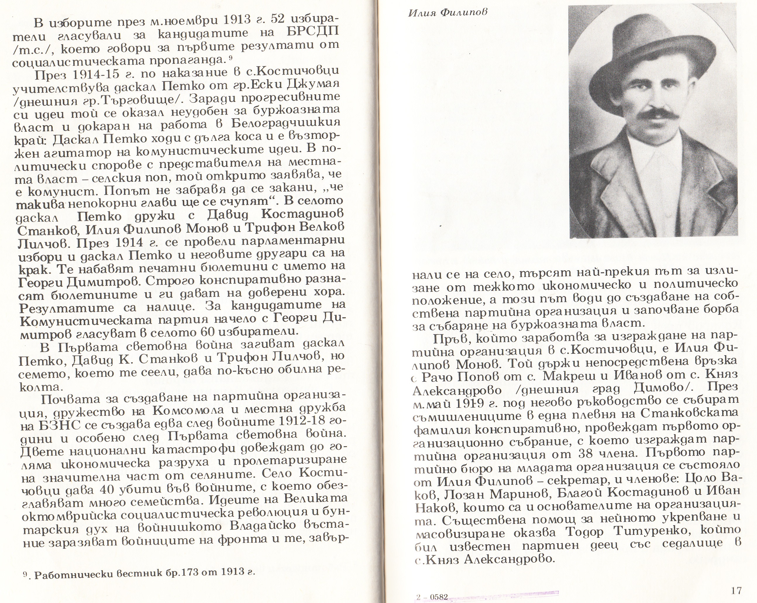 „..Семето на социализма е посято от учителя Иван Божиков 1903 г., Даскал Петко от гр. Ески Джумая дружи с Давид Костадинов Станков, Илия Филипоф Монов и Трифон Велков Лилчов…“