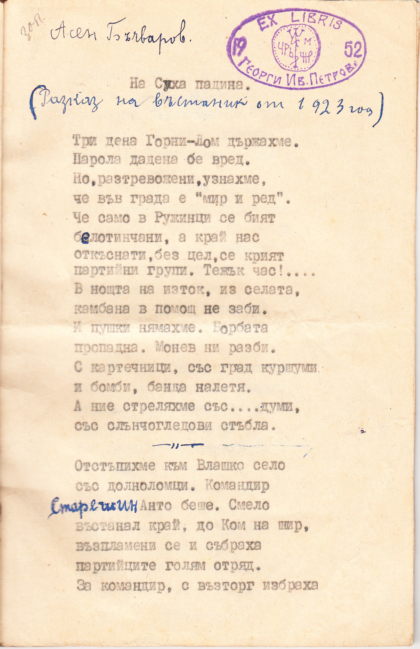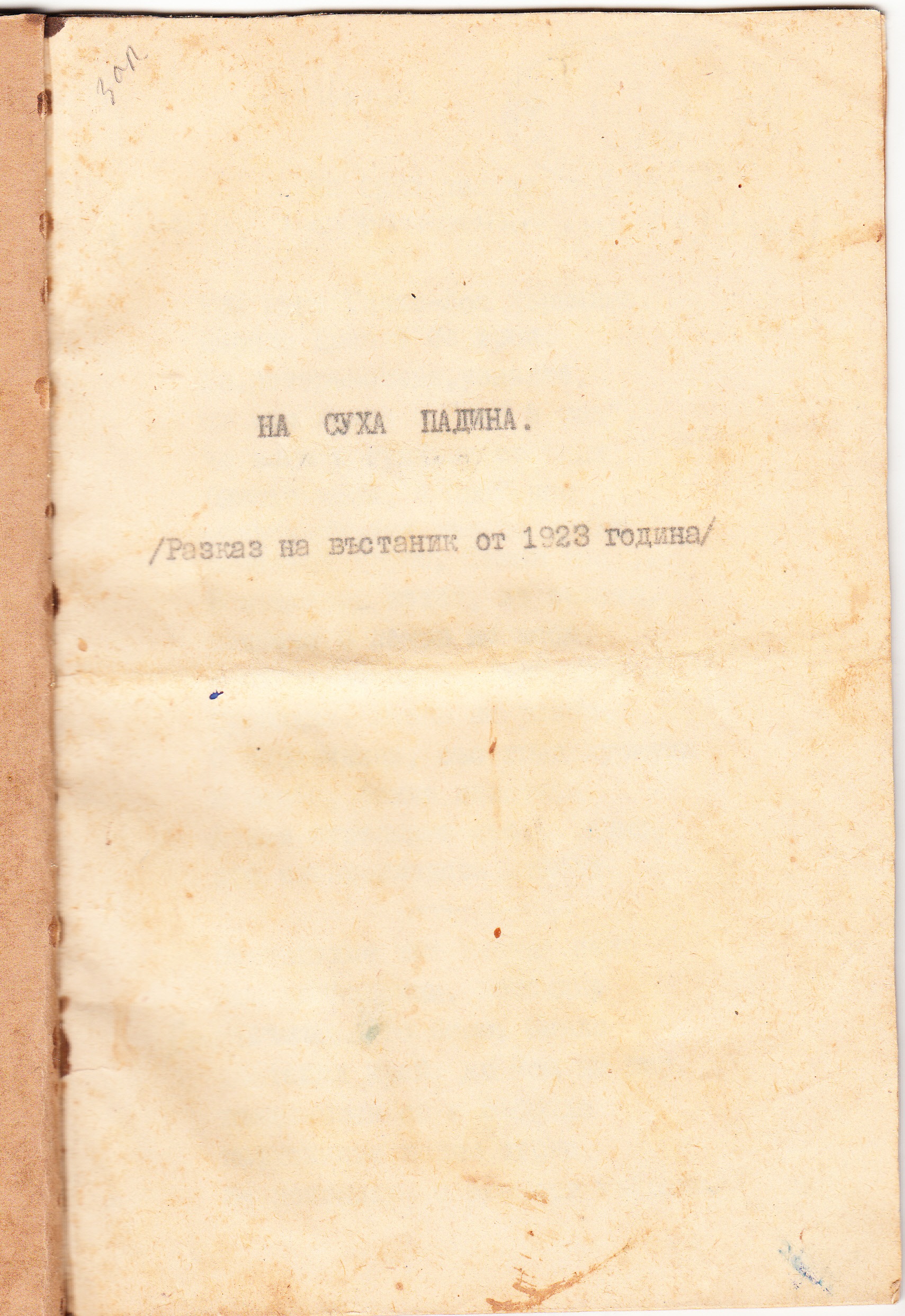 „На Суха Падина – Разказ на един въстаник от 1923 г.“ е от личната библиотека на Иван Георгиев Петров от село Бела. Оформена е като книжка, напечатана е на машина с поправки на ръка. Подписана е от Асен Балкански с надпис – Видин 1953 г.