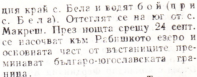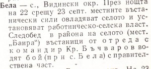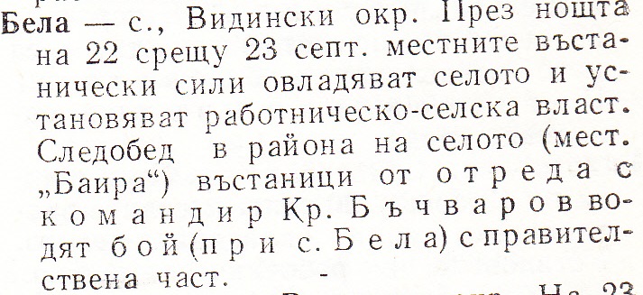 Бела– с. Видински окр. През ноща на 22 срещу 23 септ. местните въстанически сили овладяват селото и установяват работническо-селска власт. Следобед в района на селото /мест. „Баира“ / въстаници от отреда с командир Кр. Бъчваров водят бой /при с.Бела/ с правителствена част.