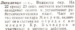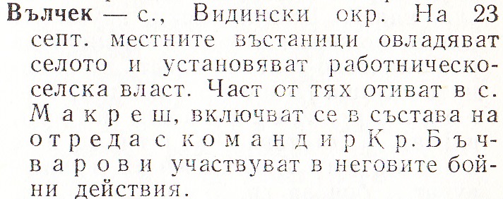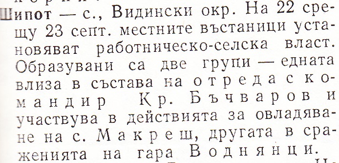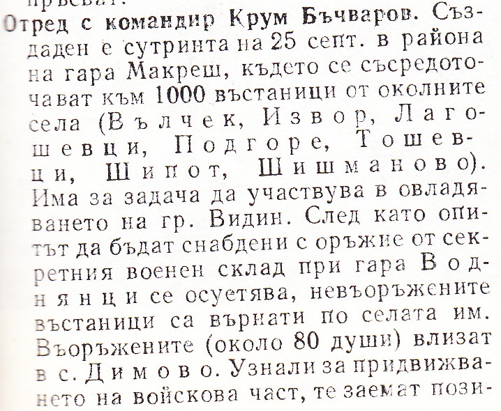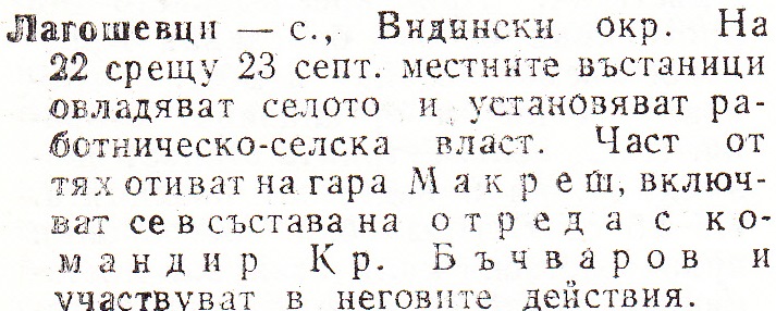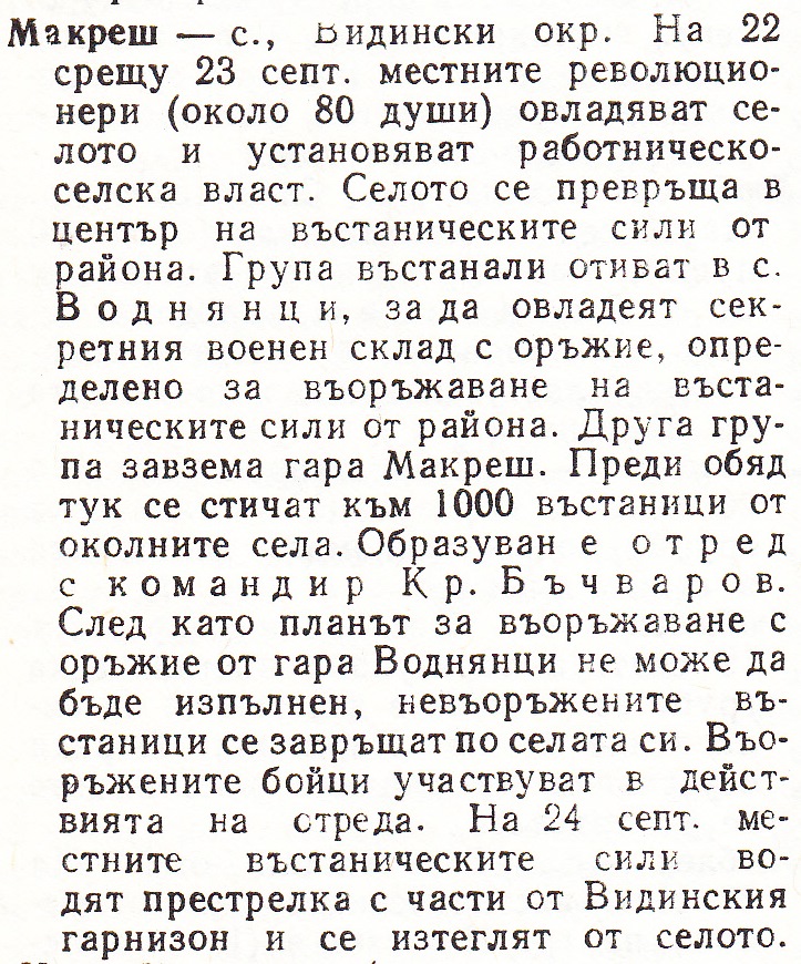 Макреш – с., Видински окр. На 22 срещу 23 септ. местните революционери /около 80 души/ овладяват селото и установяват работническо селска власт. Селото се превръща в център на въстаническите сили от района. Група въстанали отиват в село Воднянци, за да овладеят секретния военен склад с оръжие, определено за въоръжаване на въстаническите сили от района. Друга група завзема гара Макреш. Преди обяд тук се стичат към 1000 въстаници от околните села. Образуван е отред с командир Кр. Бъчваров. След като планът за въоръжаване с оръжие от гара Воднянци не може да бъде изпълнен, невъоръжените въстаници се завръщат по селата си. Въоръжените бойци участвуват в действията на отреда. На 24 септ. местните въстанически сили водят престрелка с часи от Видинския гарнизон и се изтеглят от селото.