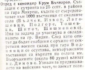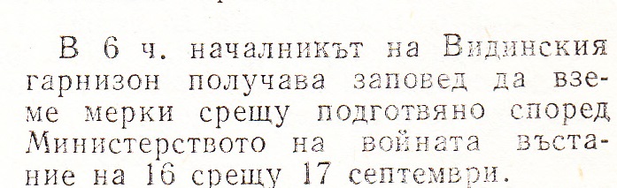 …“ В 6 ч. началника на Видинския гарнизон получава заповед да вземе мерки срещу подготвяно според Министерството на войната въстание на 15 срещу 17 Септември….“