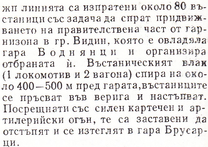 Боят при гара Воднянци. Към 16 ч. на 24 септ. от гара Брусарци по жп линията са изпратени около 80 въстаници със задача да спрат придвижването на правителствена част от гарнизона в гр. Видин, която е овладяла гара Воднянци и организира отбраната и. Въстаническия влак / 1 локомотив и 2 вагона/ спира на около 400-500 м. пред гарата, въстаниците се пръсват във верига и настъпват. Посрещнати със силен картечен и артилерийски огън, те са заставени да отстъпят и се изтеглят в гара Брусарци.