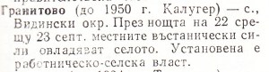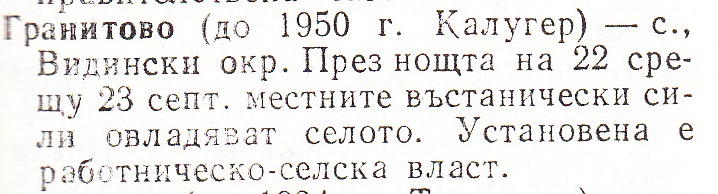 Гранитово /до 1950 г. Калугер/ – с. Видински окр. През ноща на 22 срещу 23 септ. местните въстанически сили овладяват селото. Установена е работническо селска власт.