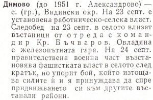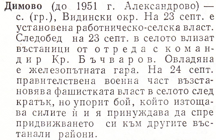Димово / до 1951 г. Александрово/ – с., Видински окр. На 23 септ. е установена работническо селска власт. Следобед на 23 септ. в селото влизат въстаници от отреда с командир Кр.Бъчваров. Овладяна е железопътната гара. На 24 септ. правителствена военна част въстановява фашистката власт в селото след кратък, но упорит бой, който изтощава силите и- и я принуждава да спре придвижвнето си към другите въстанали райони.