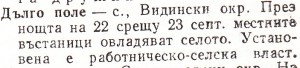 Дълго поле – с. , Видински окр. През нощта на 22 срещу 23 септ. местните въстаници овладяват селото. Установена е работническо-селска власт.