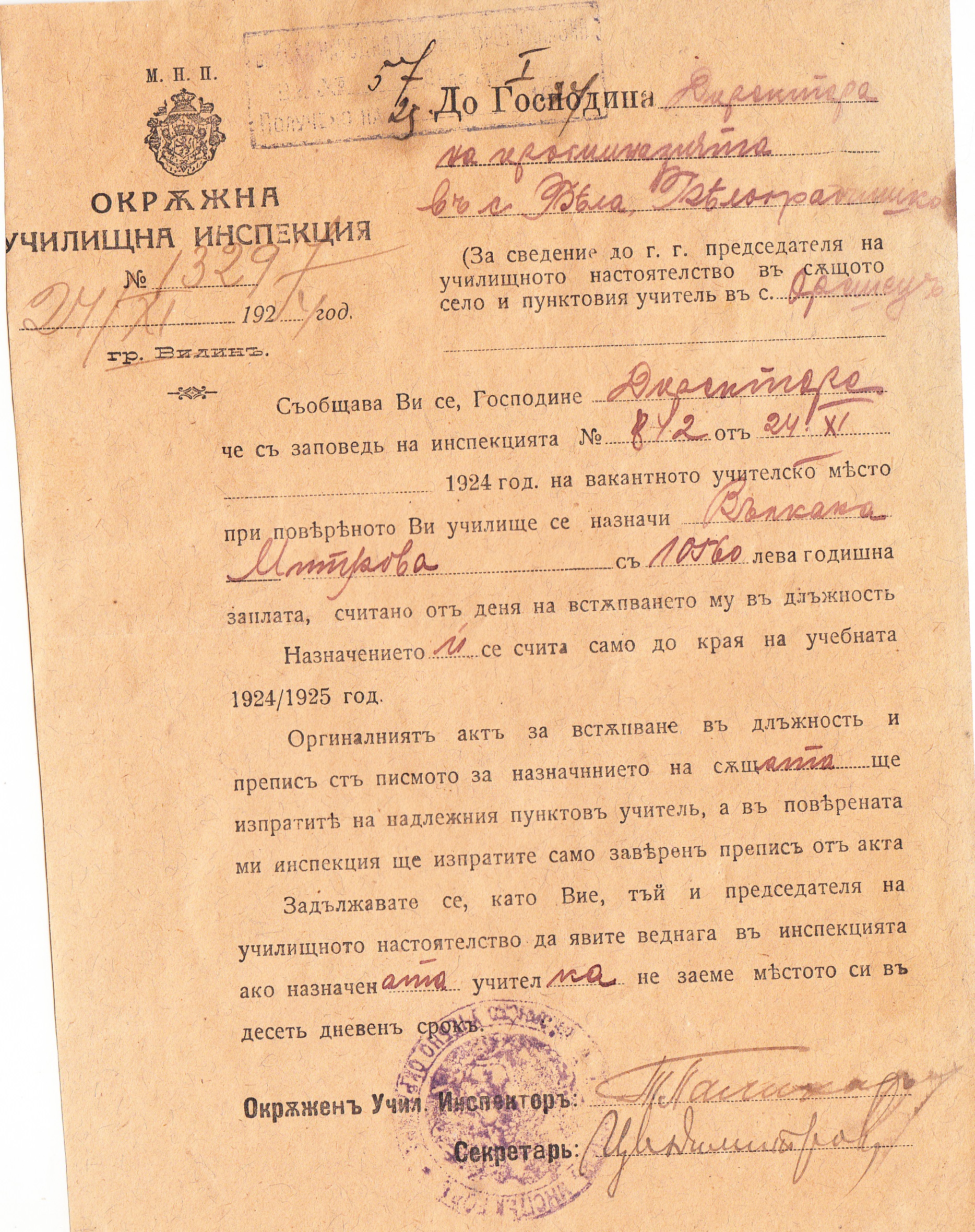 Документ N 329.24.11.1924 г. за назначаване на Вълкана Митрова.