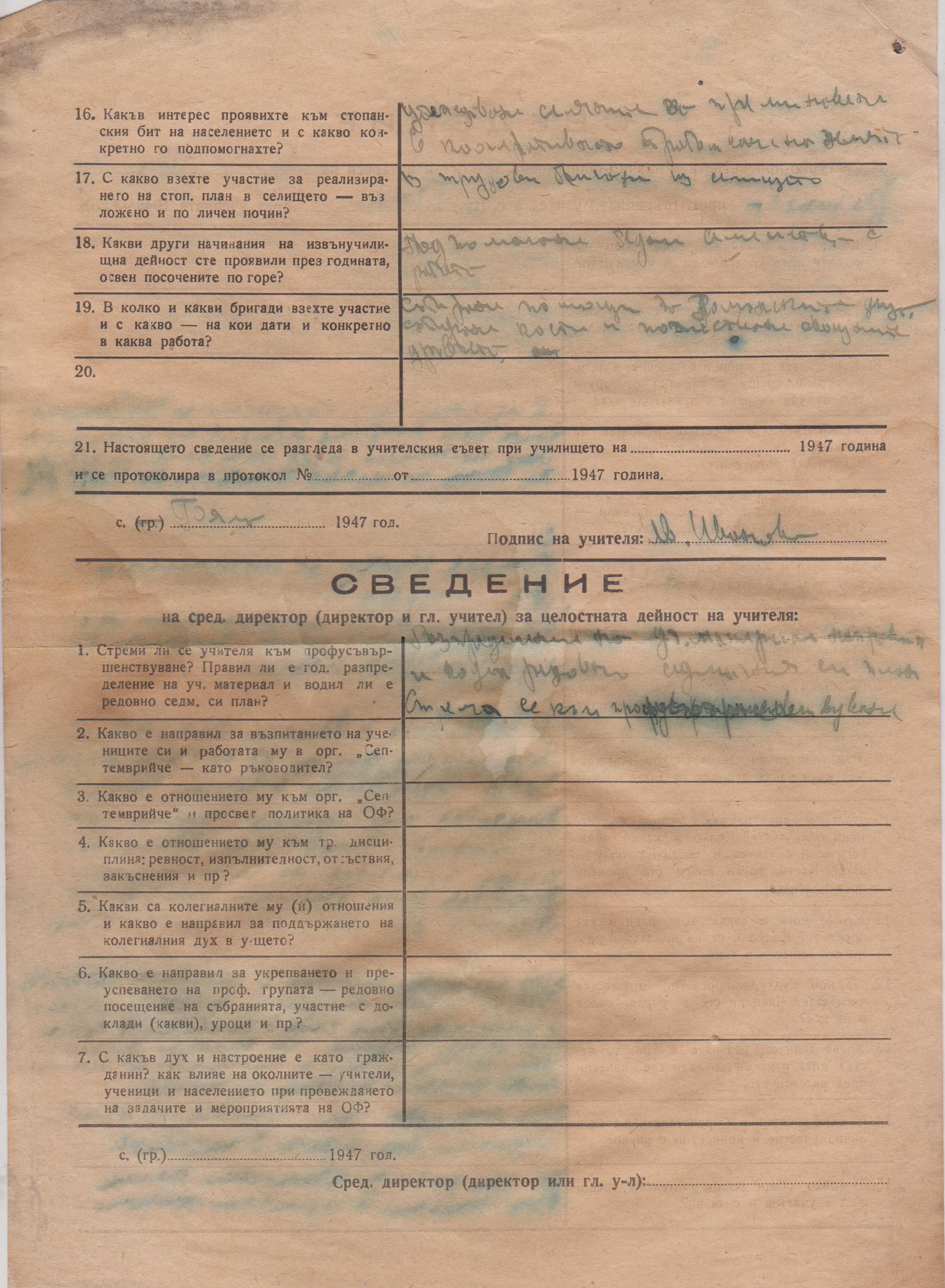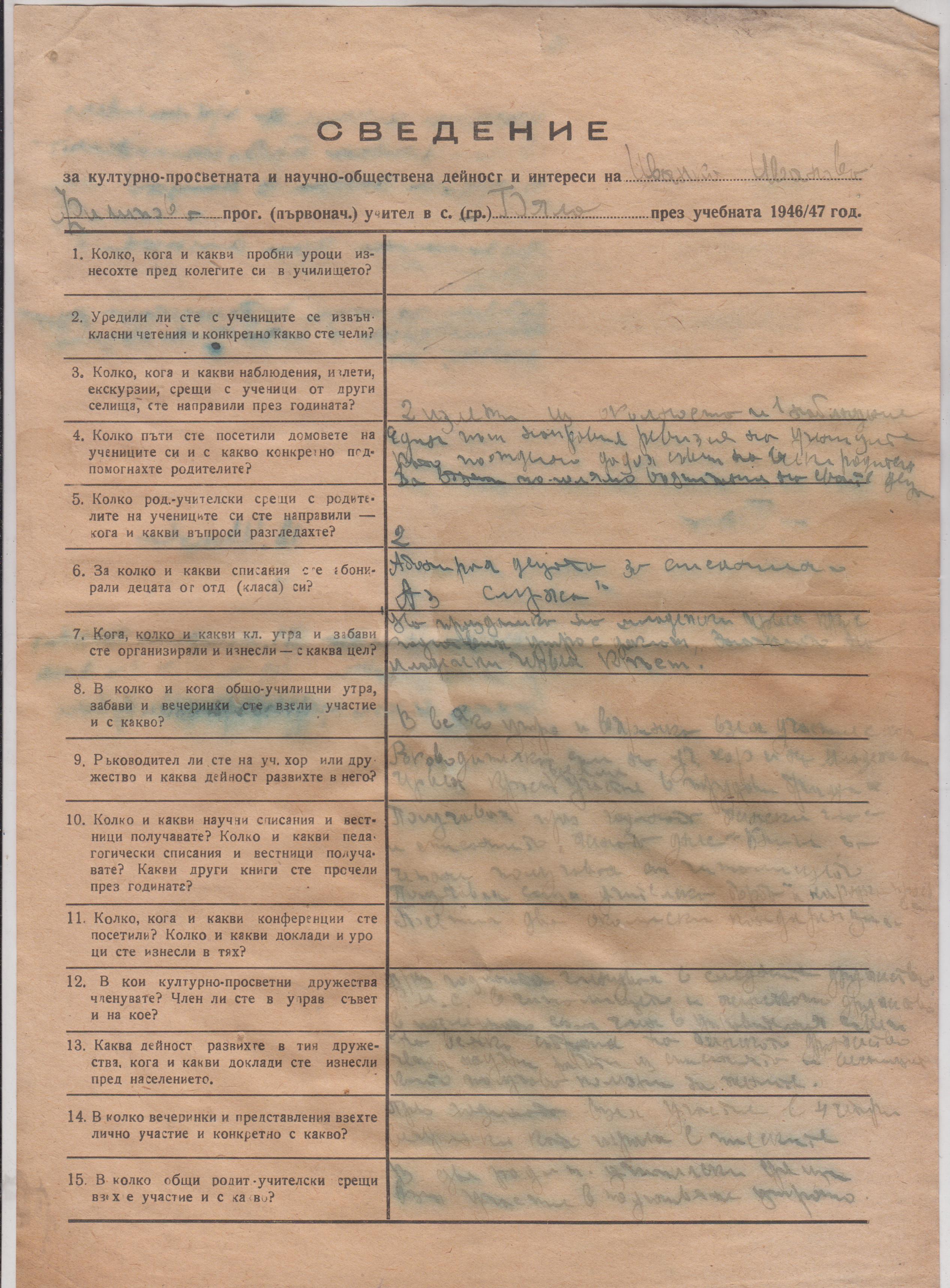за културно-просветната и научно-обществената дейност и интереси на Иванка Иванова Филипова прог./първонач./ учител в с.Бела през учебната 1946/47 год.