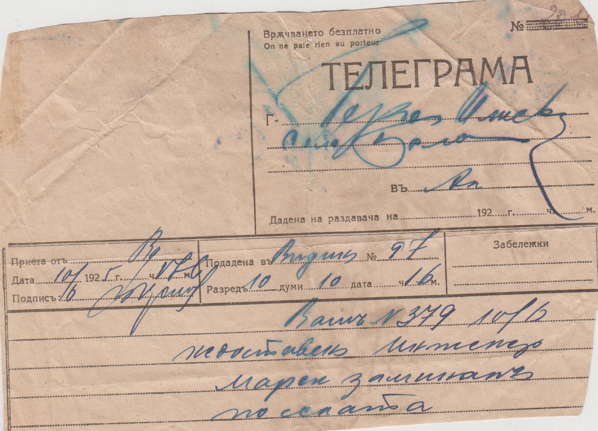 Една телеграма от гр.Видин до с.Бела от 1925 г.