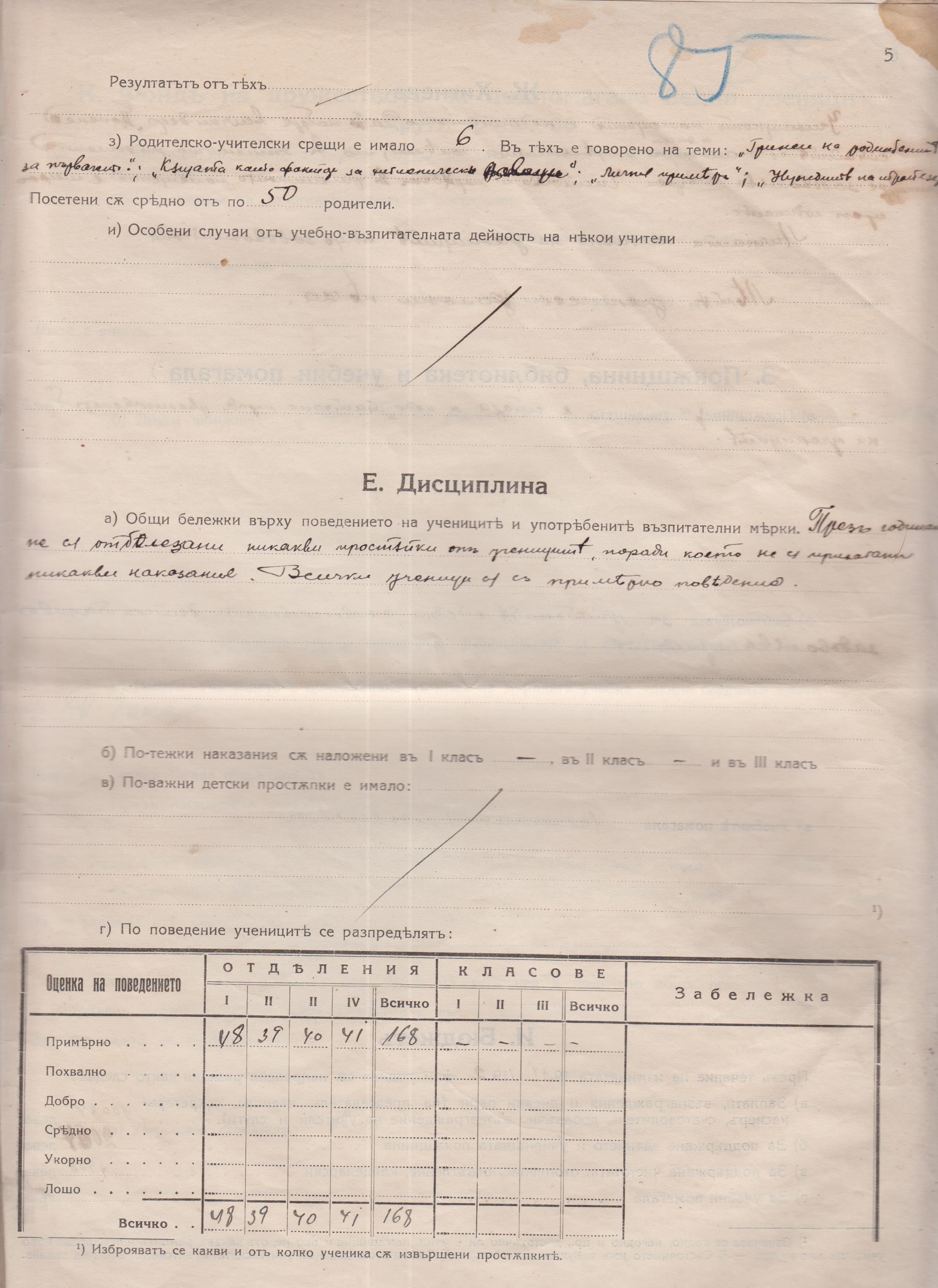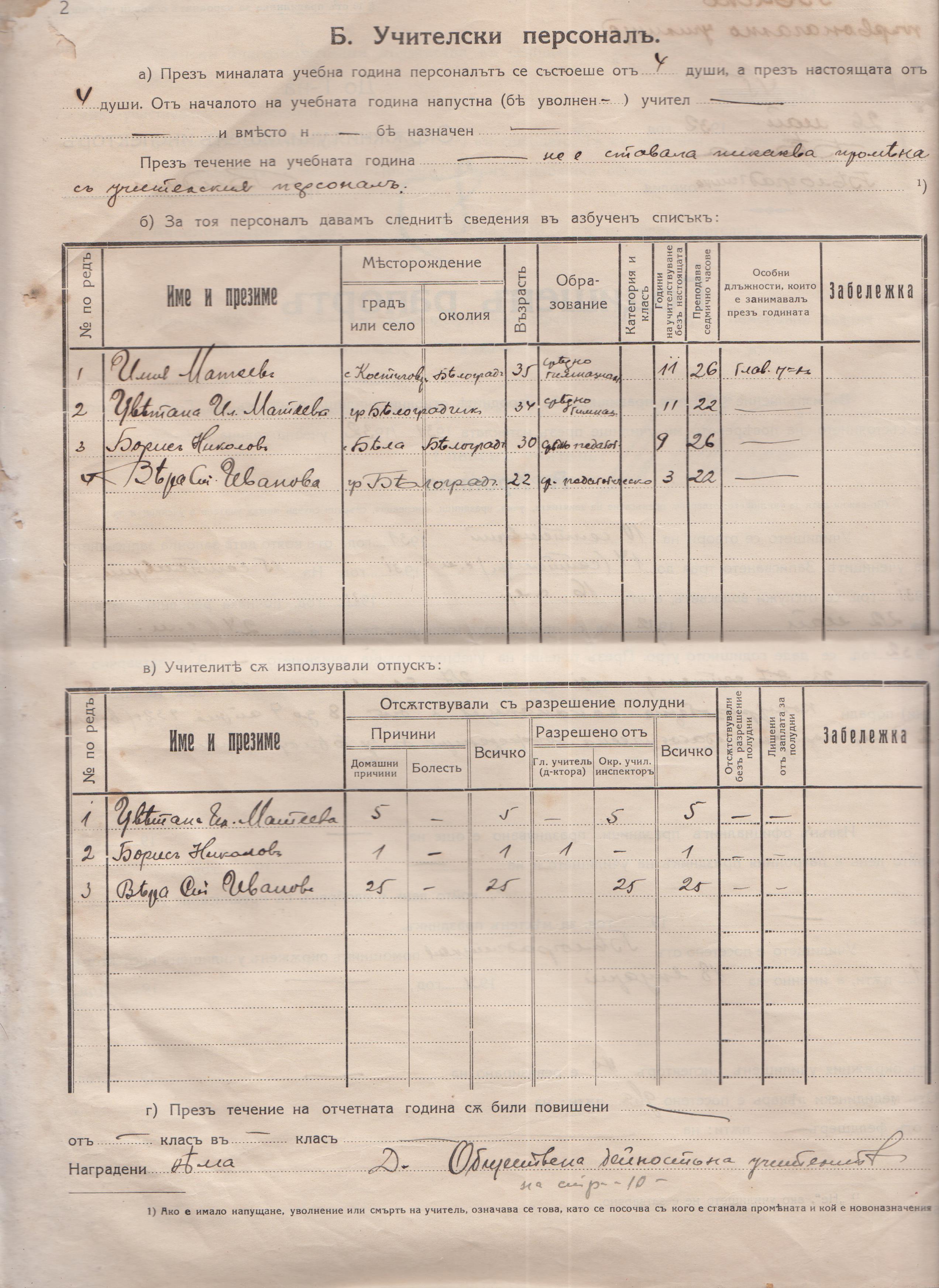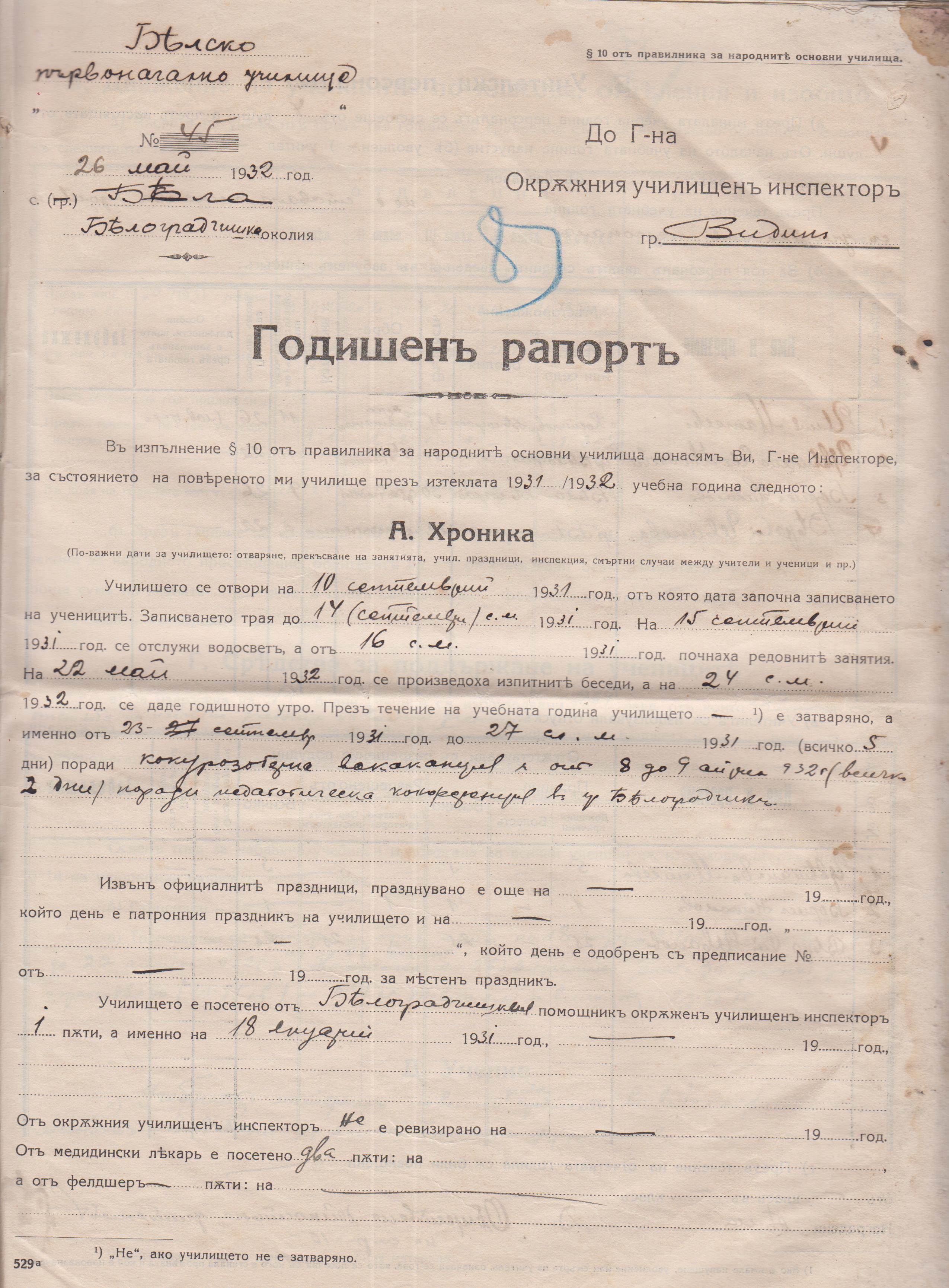 Училището се отвори на 10.09.1931 г. от която дата започна записването до 14.09.1931 г. На 15 Септември се отслужи водосвет и от 16 Септември започнаха редовни учебни занятия до 22 Май 1932 г. Изпитните беседи се проведоха на 24 Май, същата година. Училището е затваряно от 23 до 27 Септември за кукурузена ваканция и от 8 до 9 Април 1932 г. поради педагогическа конференция в Белоградчик. Училището е посетено от Белоградчишкия помощник окръжен училищен инспектор на 18 Януари 1932 г.