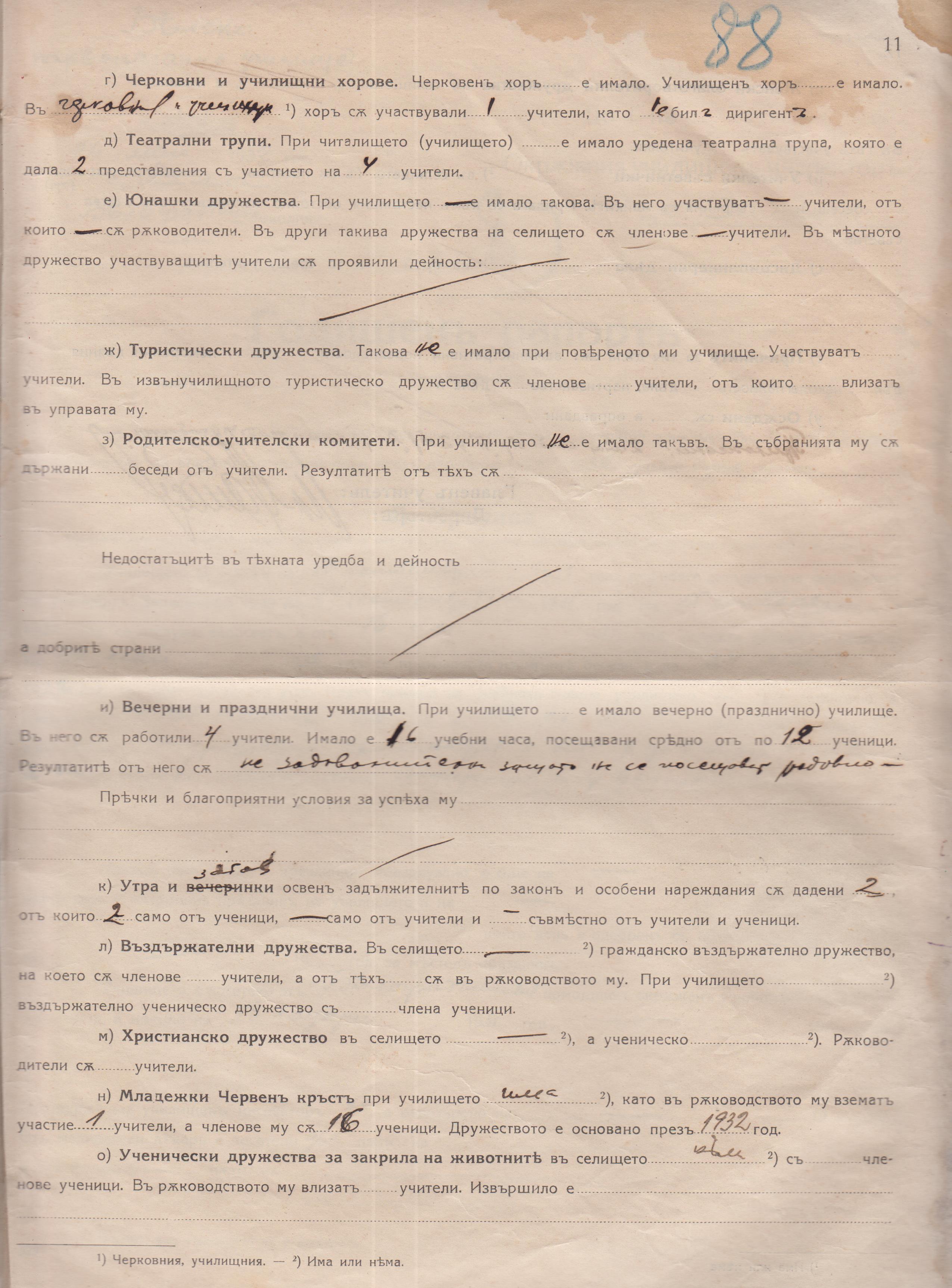 Имало е училищен и черковен хор с участието на един учител. Театралната трупа е дала две прадставления с участието на 4 учители. Имало е вечерно училище с участие на 4 учители – 16 часа , посещавани от 12 ученика. Младежки червен кръст е основан 1932 г. , членуват 16 ученика и един учител.