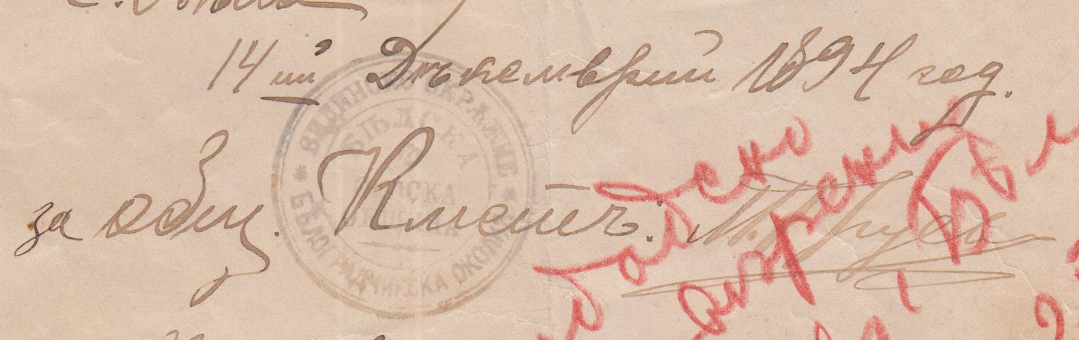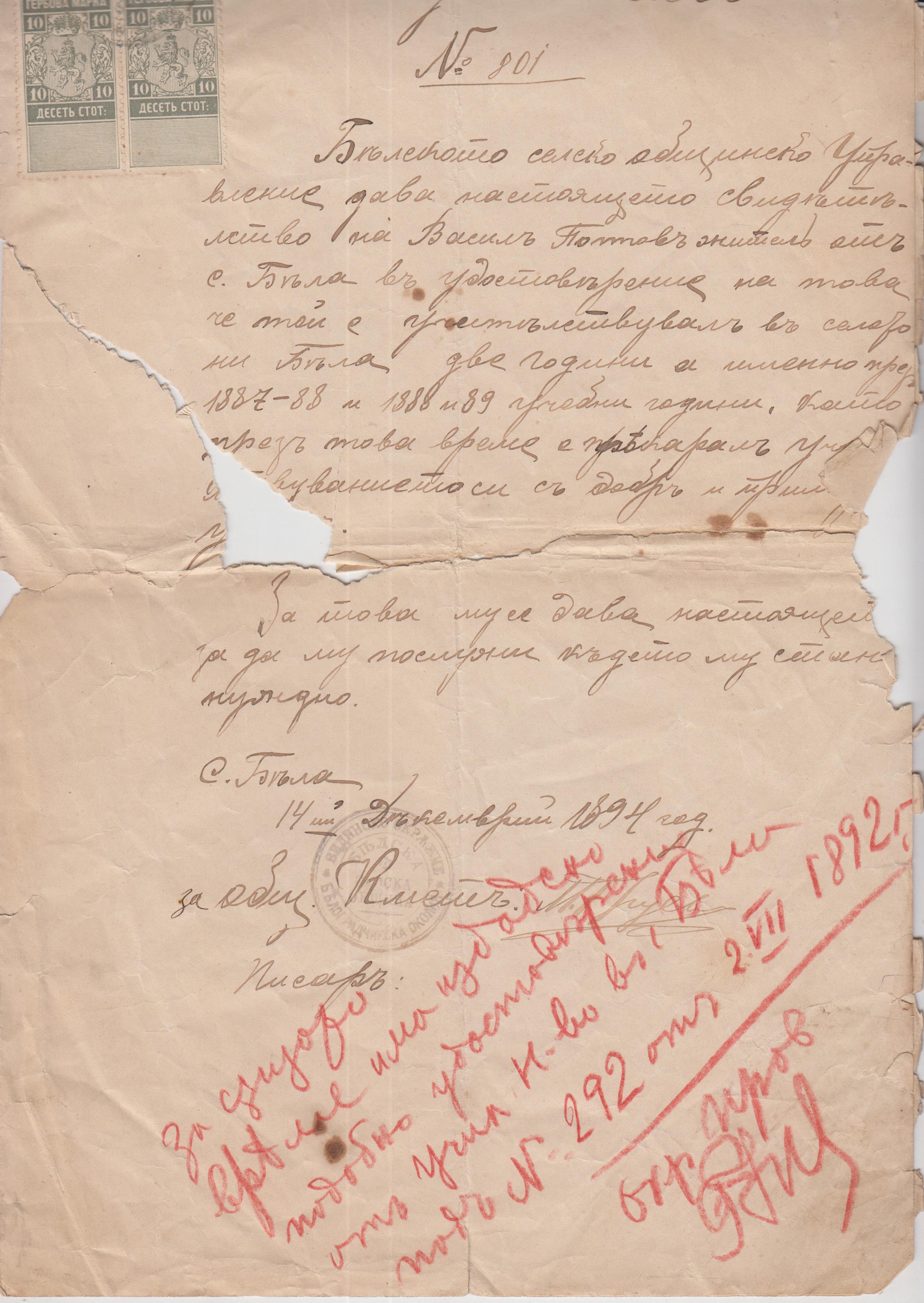 …“ за същото време има издадено подобно удостоверение от училищното настоятелство в с.Бела под N 292 от 2.07.1892 г. окр.пров. /П/ …“