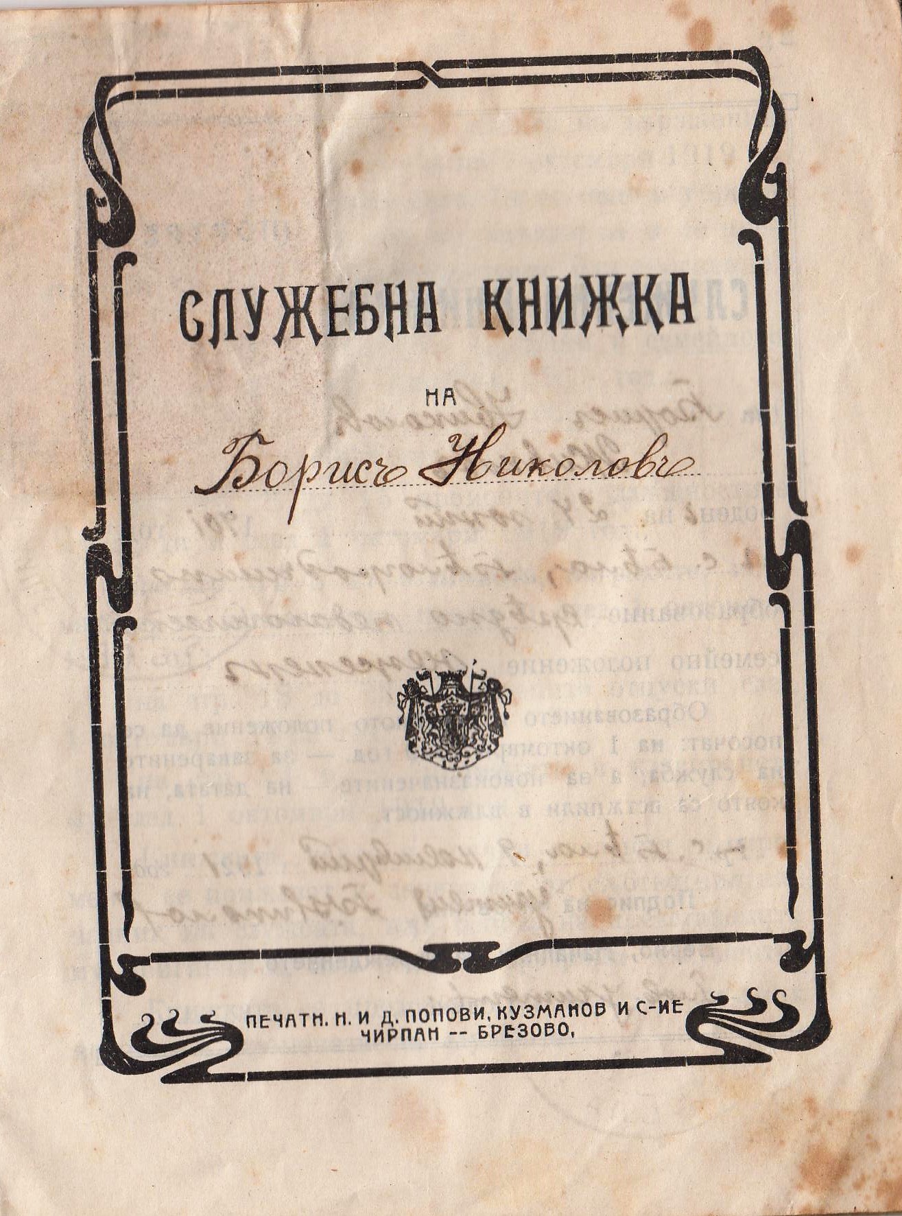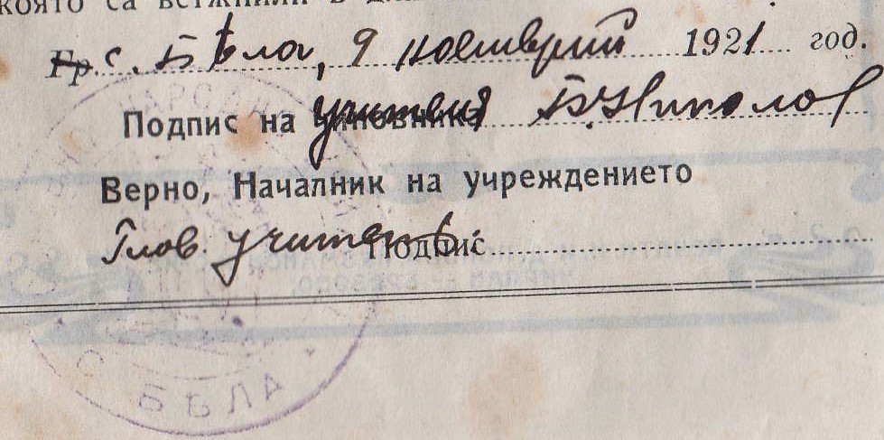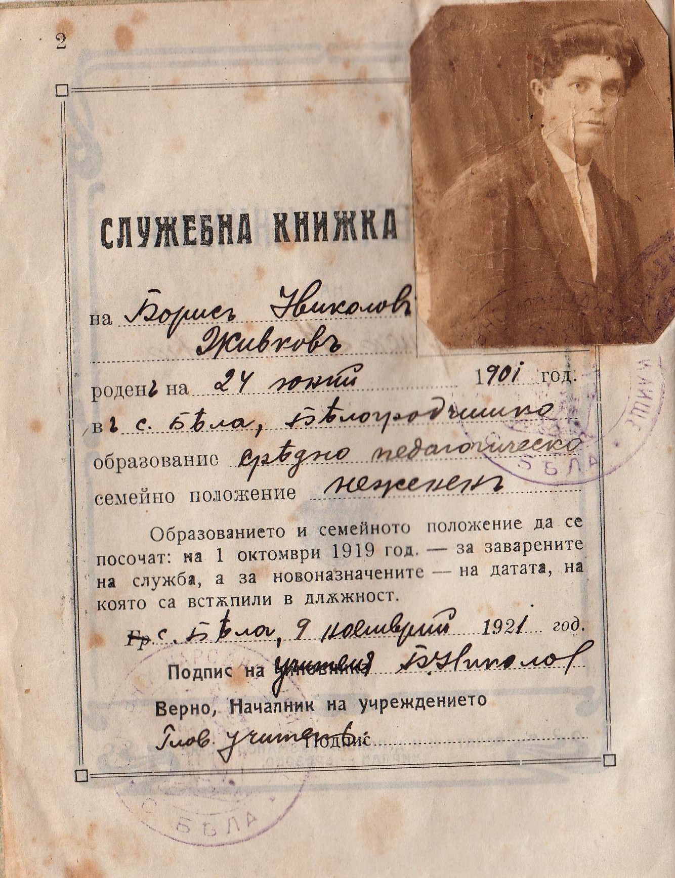Борис Николов Живков /24.06.1901 – 1984 г./е известен учител от село Бела, тук ви представям неговата служебна книжка издадена от Белското училище на 09.11.1921 г. след завършването му на педагогическата прогимназия в гр.Лом.