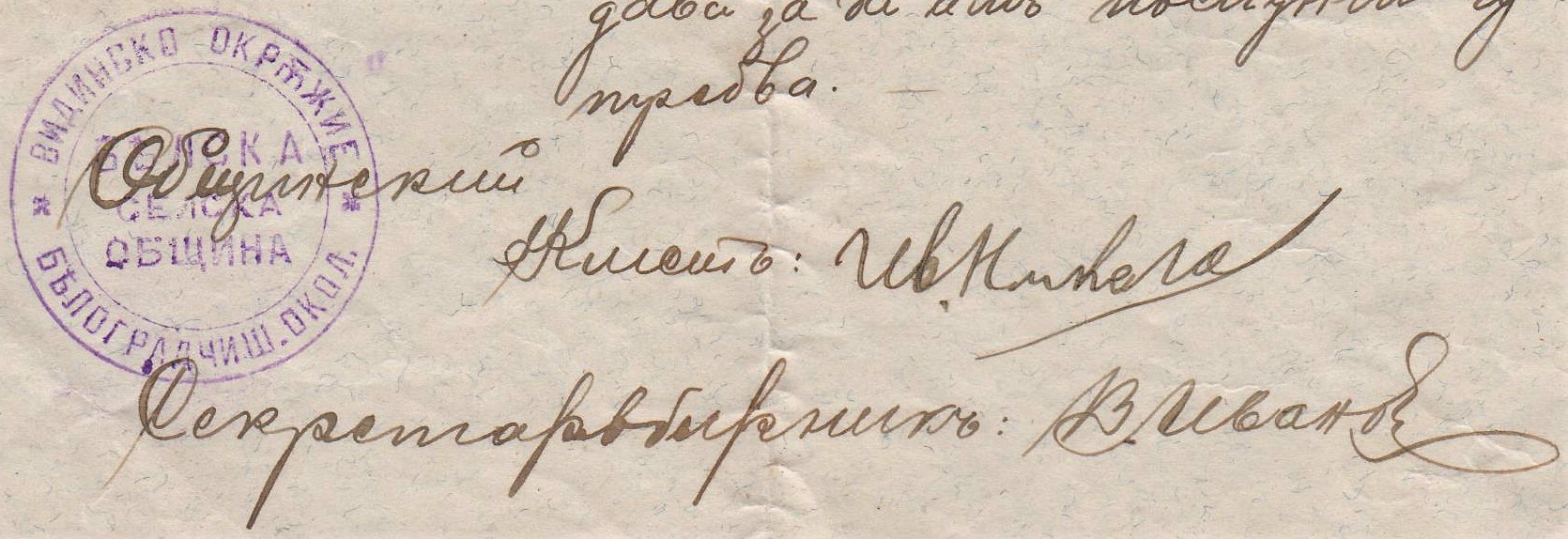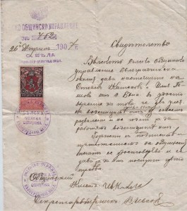 …“ Белското Селско Общинско Управление ,Белоградчишка околия дава настоящето на Стоян Каменов и Илия Пешев от с.Бела в удостоверение на това, че два улея от водениците им /находящи се в с.Бела/ са съвсем развалени и негодни за да работят водениците им…..“