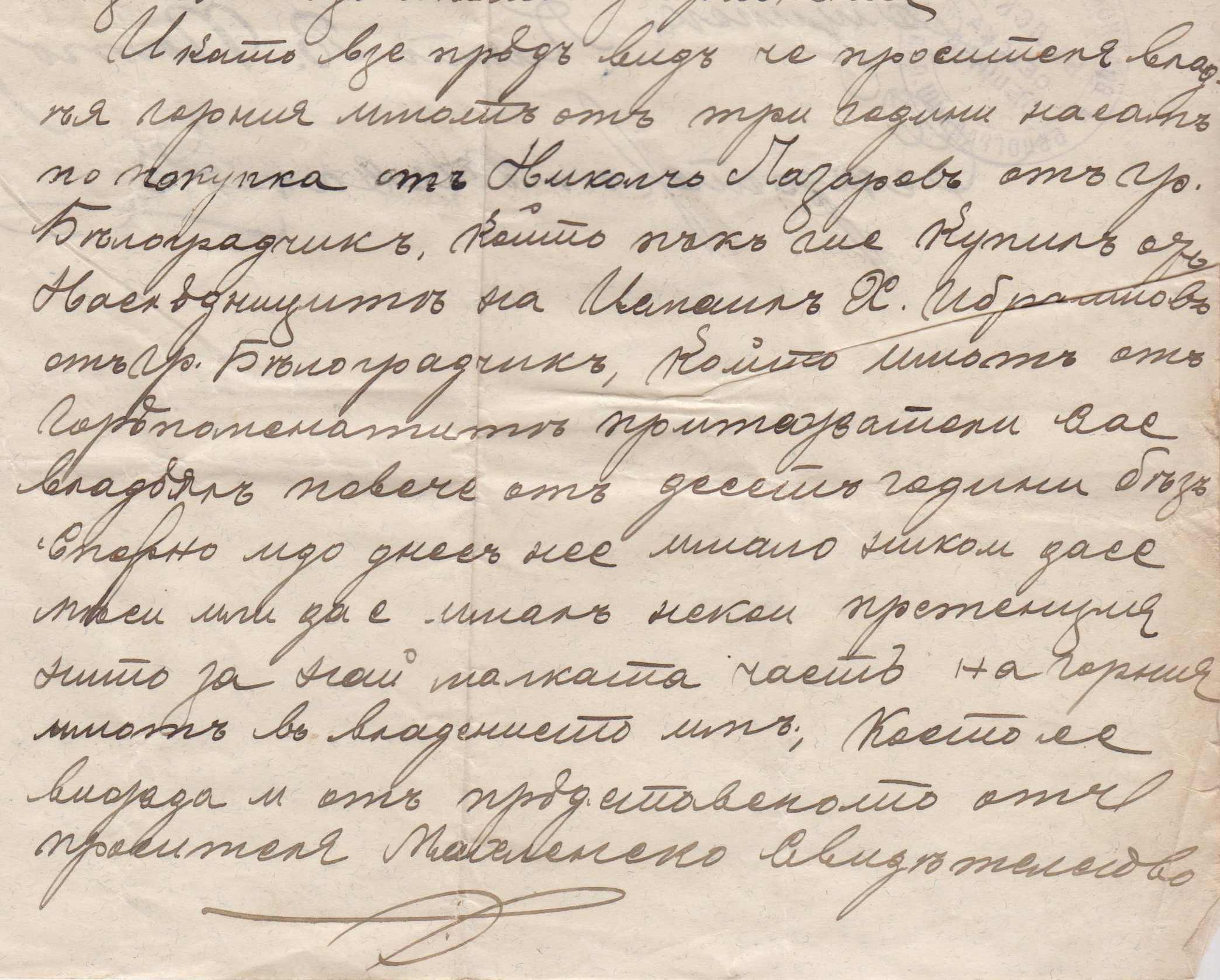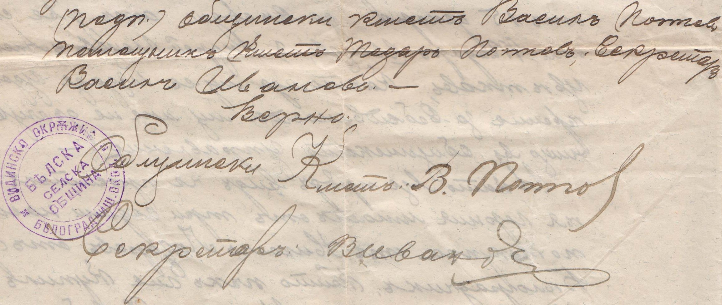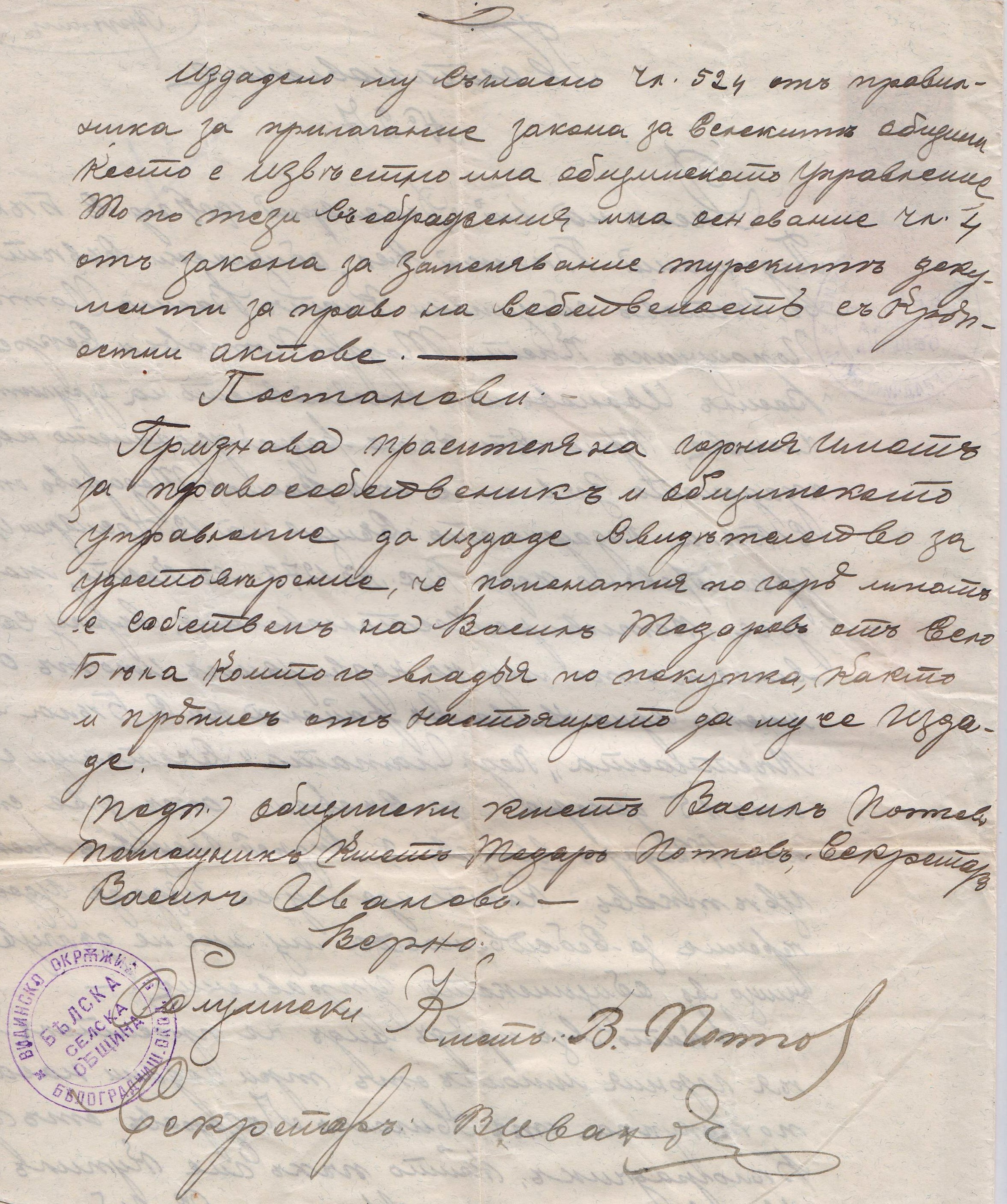 „Днес на 1 Декемврий 1906 год. с. Бела. Подписаний Белский Селски Общински Съвет в състав общински Кмет Васил Попов, Помощник Кмет Тодор Панов и Секретар Васил Иванов и в отсъствието на другите членове, пристъпи към разглеждане на подаденото заявление от Васил Тодоров от с.Бела, подадено от същия на 12 Ноемврий 1906 год. зарегистрирано под вх.N1273…. с което моли да се мотивира постановление върху собствеността му на недвижим имот, а именно: Една нива в района на с.Бела в местността “ Под Гламата“ състояща се от 15 декара до съседи: от две страни Тодор Йоцов, 3. Андрей Йоцов, 4. Алекси Цветков, като му се издаде удостоверение препис за собственоственоста му и че не дължи нищо в общинското управление…..“