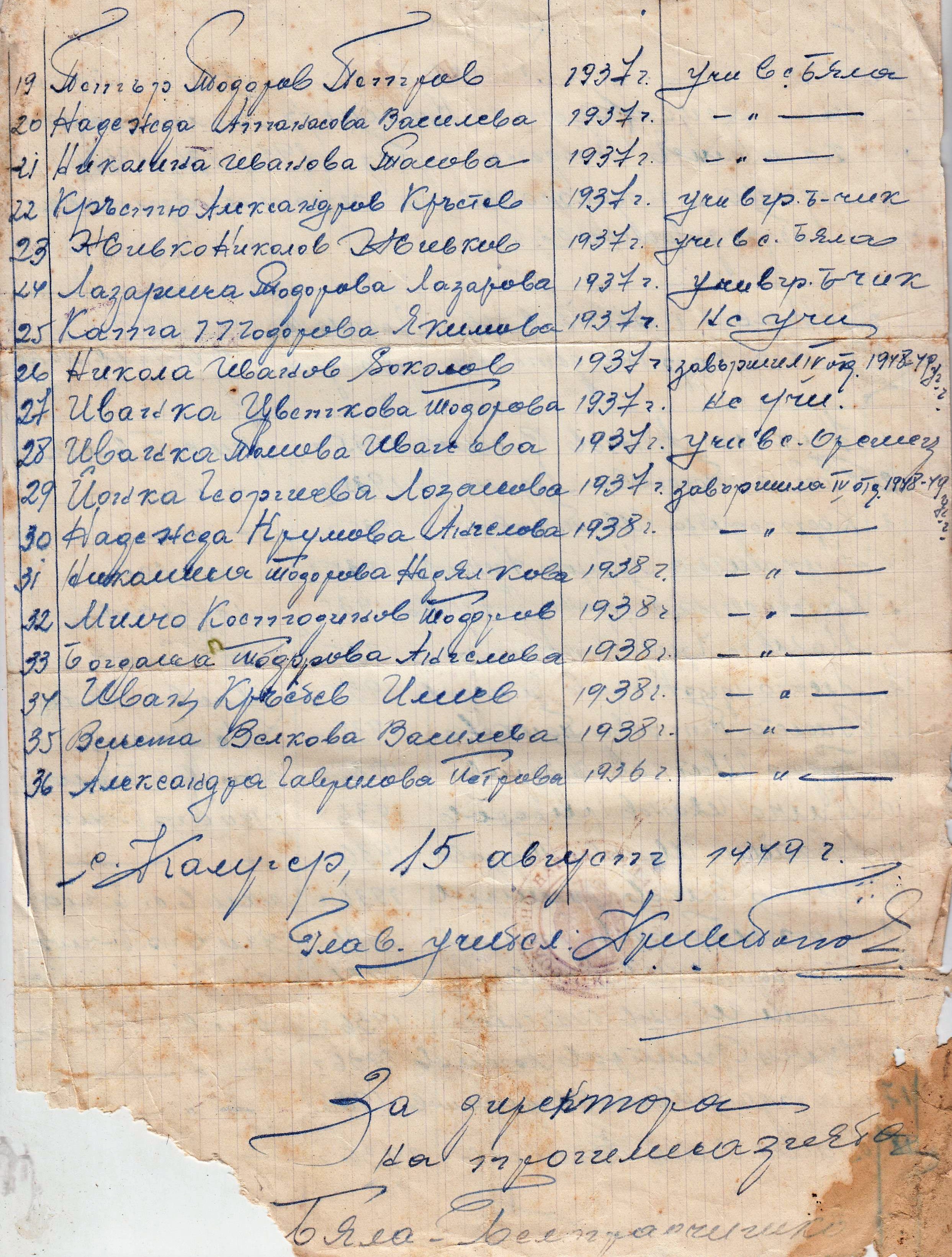 1.Никола Антов Василев – 1935г. учи с.Бела, 2.Райна Тодорова Лозанова-1935г. с.Бела, 3.Костадина Иванова Тасева-1935г. с-Бела, 4.Николина Лазарова Николова-1935г. ???, 5.Костадина Тодорова Секулова-1935г. ???, 6.Мария Кръстева Николова-1935г. ???, 7.Александър Николов Симеонов-1935г. с.Бела, 8.Виолета Петрова Панкова-1935г. ???, 9.Тодор Цветков Тодоров-1936г. с.Бела, 10.Милчо Иванов Григоров-1936г. гр.Белоградчик, 11.Людмила Иванова Тодорова-1936г. гр.Белоградчик, 12.Иван Велков Димитров-1936г. с.Бела, 13.Георги Петров Георгиев-1936 г. гр.Белоградчик, 14.Костадина Иванова Найденова-1936г. гр.Белоградчик, 15.Емил Иванов Василев-1936г. с.Бела, 16.Вълчо Димитров Лозанов-1936 г. с.Бела, 17.Йордан Иванов Герасимов-1938 г. с.Бела, 18.Васил Илиев Василев-1936 г. с.Бела, 19.Петър Тодоров Петров.1937г. с.Бела, 20.Надежда Атанасова Василева-1937г. с.Бела, 21.Николина Иванова Томова-1937г. с.Бела, 22.Кръсто Александров Кръстев-1937г. гр.Белоградчик, 23.Живко Николов Живков-1937г. с.Бела, 24.Лазаринка Тодорова Лазарова-1937г. гр.Белоградчик, 25.Ката Тодорова Якимова-1937 г. ???, 26.Никола Иванов Соколов – 1937 г. зав. 4-то отд.1948/49 г., 27.Иванка Цветкова Тодорова-1937г. ???, 28.Иванка Томова Иванова-1937г. с.Орешец, 29.Йонка Георгиева Лозанова-1937г. зав. 4-то отд.1948/49 г., 30.Надежда Крумова Ангелова-1938г. зав. 31.Николина Тодорова Недялкова-1938г. зав., 32.Милчо Костадинов Тодоров-1938г. зав., 33.Богдана Тодорова Ангелова-1938г. зав. 34. Иван Кръстев Илиев-1938 г. зав., 35. Венета Велкова Василева-1938г. зав., 36.Александра Гаврилова Петрова-1938г. зав.