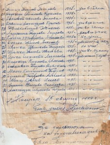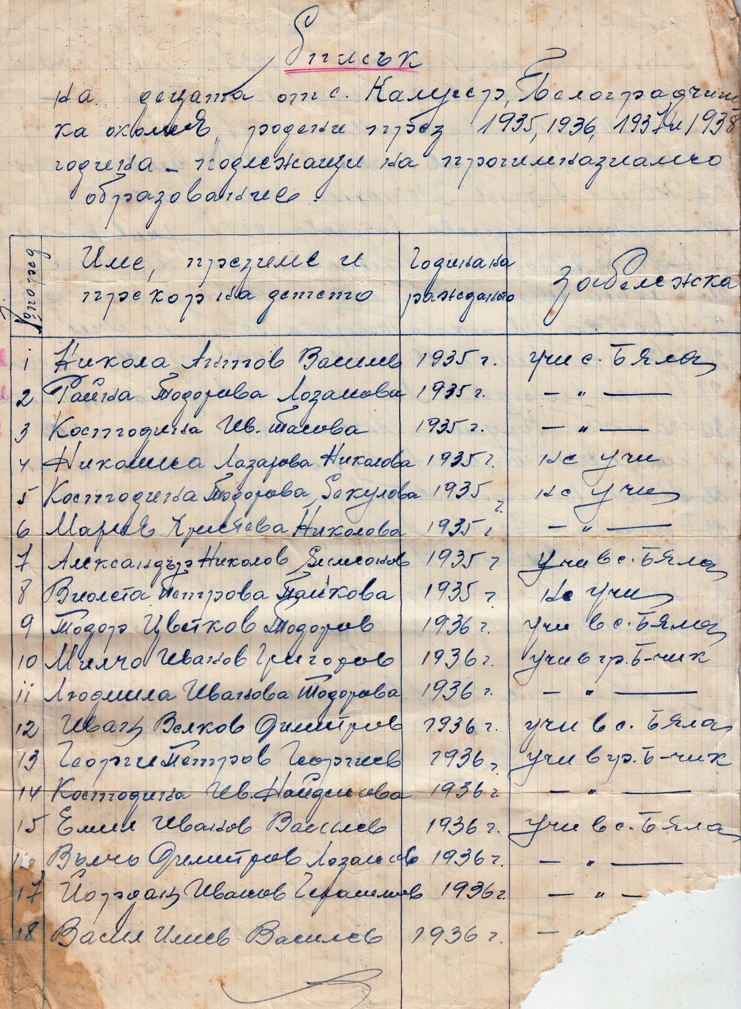„Списък на децата от с.Калугер, Белоградчишка околия, родени през 1935, 36, 37 и 1938 година – подлежащи на прогимназиално образование.“