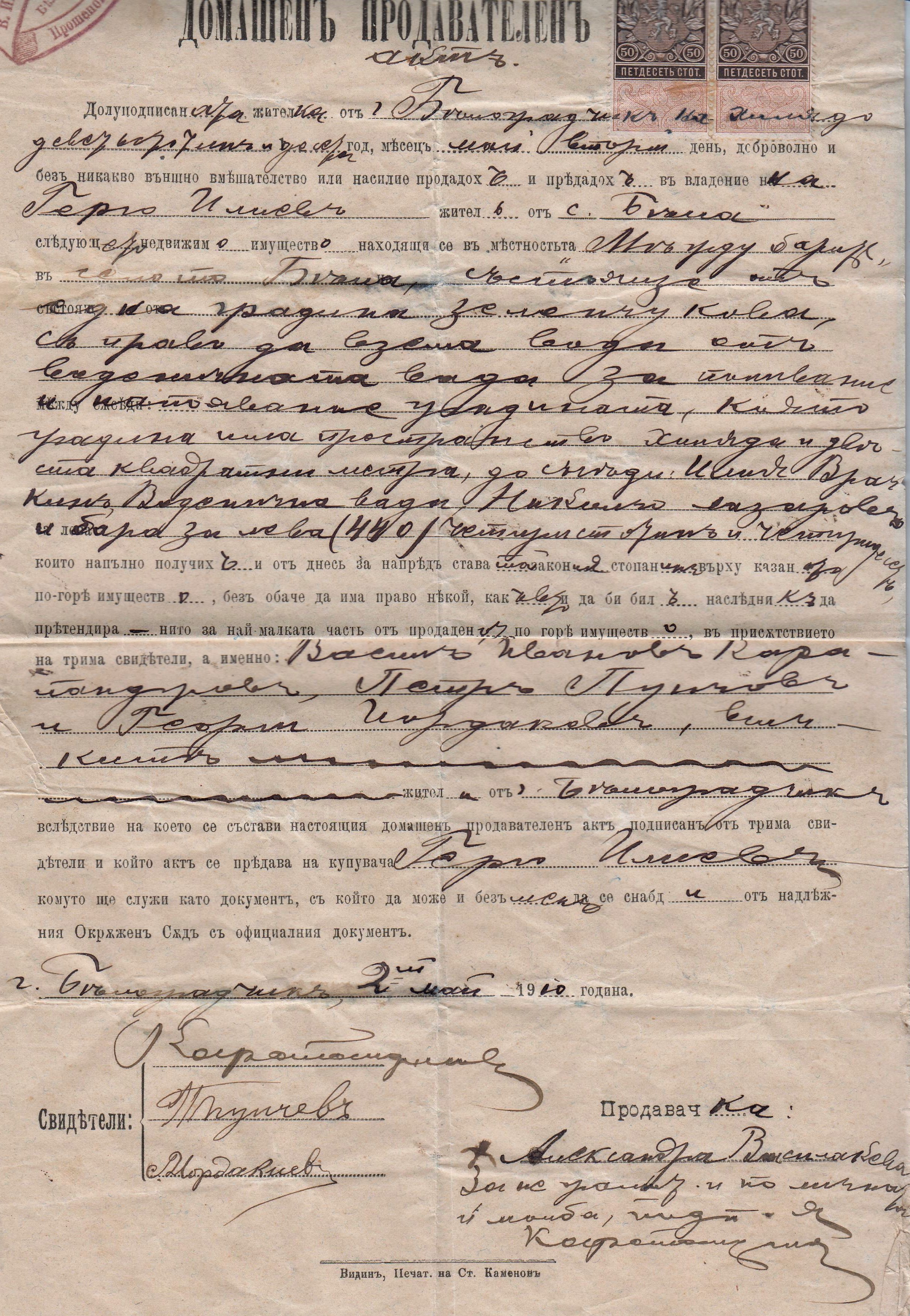 Свидетели: Васил Иванов Карапанджев гр.Белоградчик, Петър Пунчов гр.Белоградчик, Георги Йорданов гр.Белоградчик, Александра Василакева подписана от В.Ив.Карапанджев.