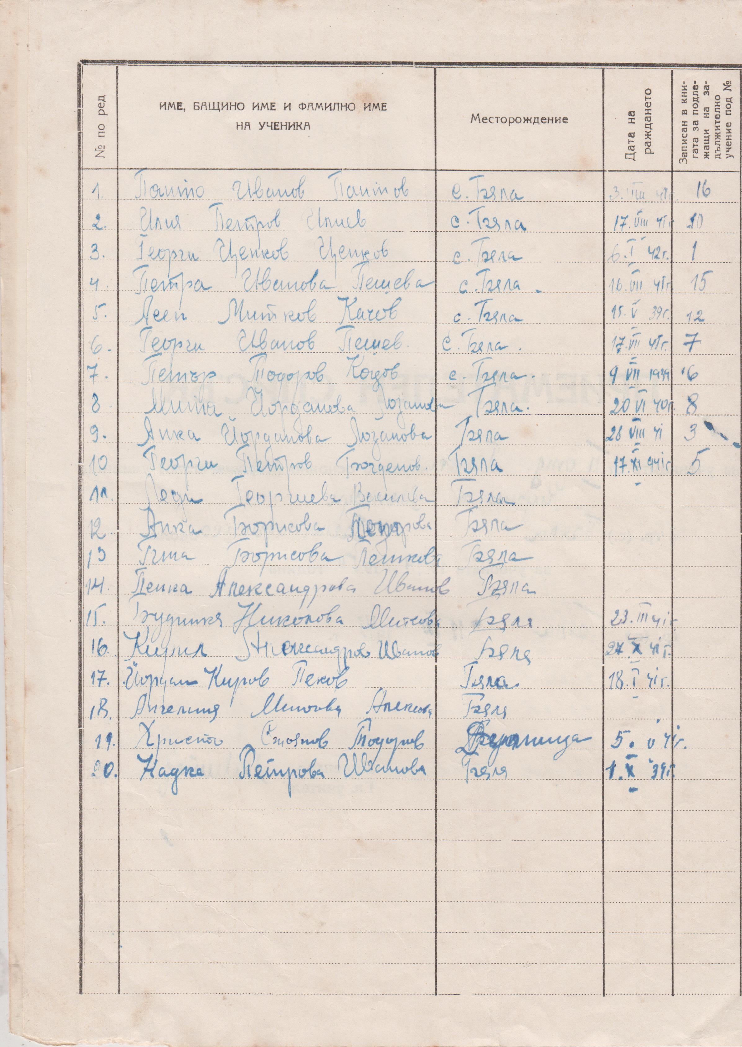 1.Любен Митов Вълчев-19.02.1940г., 2.Петър Петко Цолов-15.07.1942г., 3.Цветанка Ст.Пекова-2.09.1942г., 4.Неди Пунчов Русинов-7.11.1942 г., 5.Ценко Първанов Василев-???, 6.Тодорка Иванова Ангелова-1.10.1942 г., 7.Лили Таскова Луканова-???, 8.Филипина Лозанова Цекова-18.04.1942 г., 9.Станчо Вълчев Митов-???.