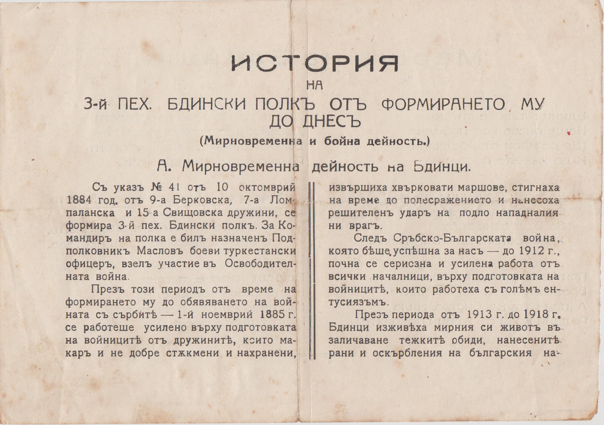 „ИСТОРИЯ на 3 – й пех. Бдински полк от формирането му до днес“