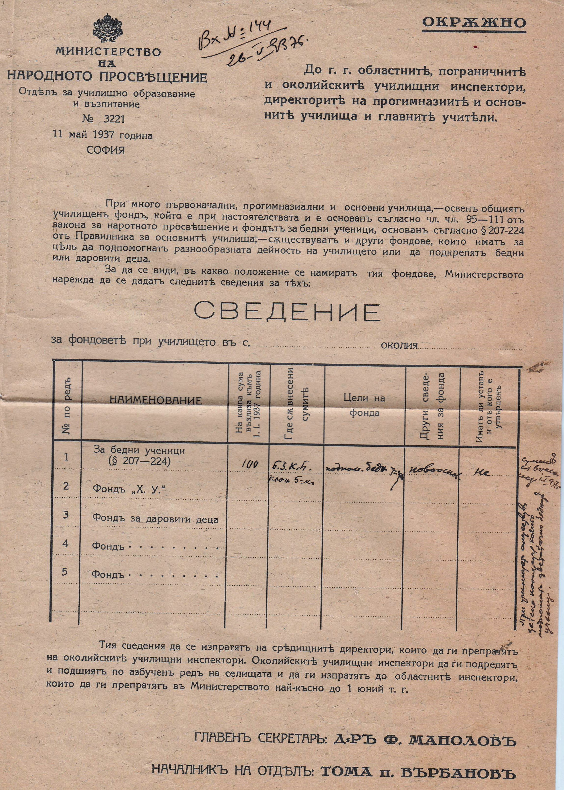 СВЕДЕНИЕ за фонда в Белското училище – Вх.N144/26.05.1937 г.