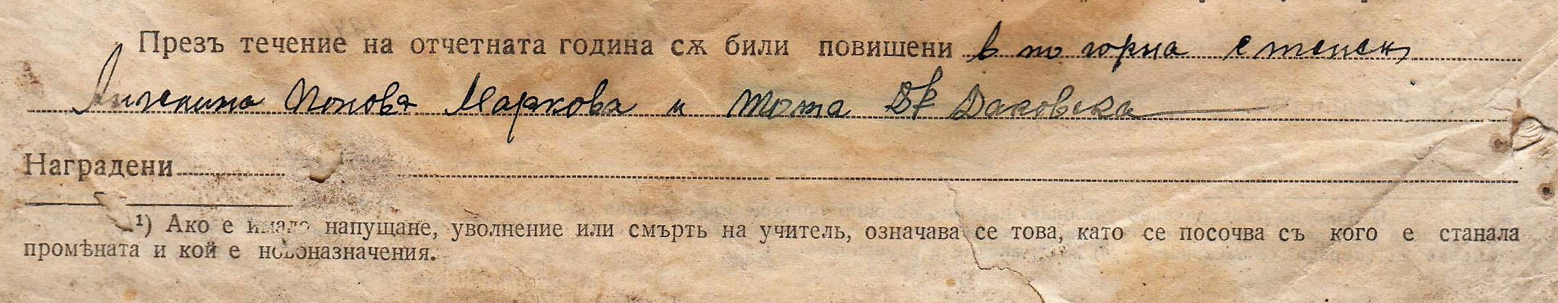 През учебната година са повишени в по-горна степен учителите -Ангелина поп Маркова и Тота д-р Даковска.