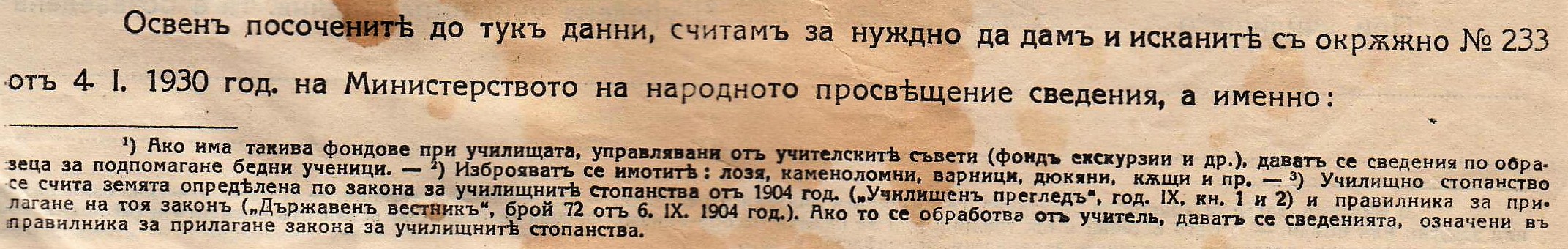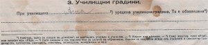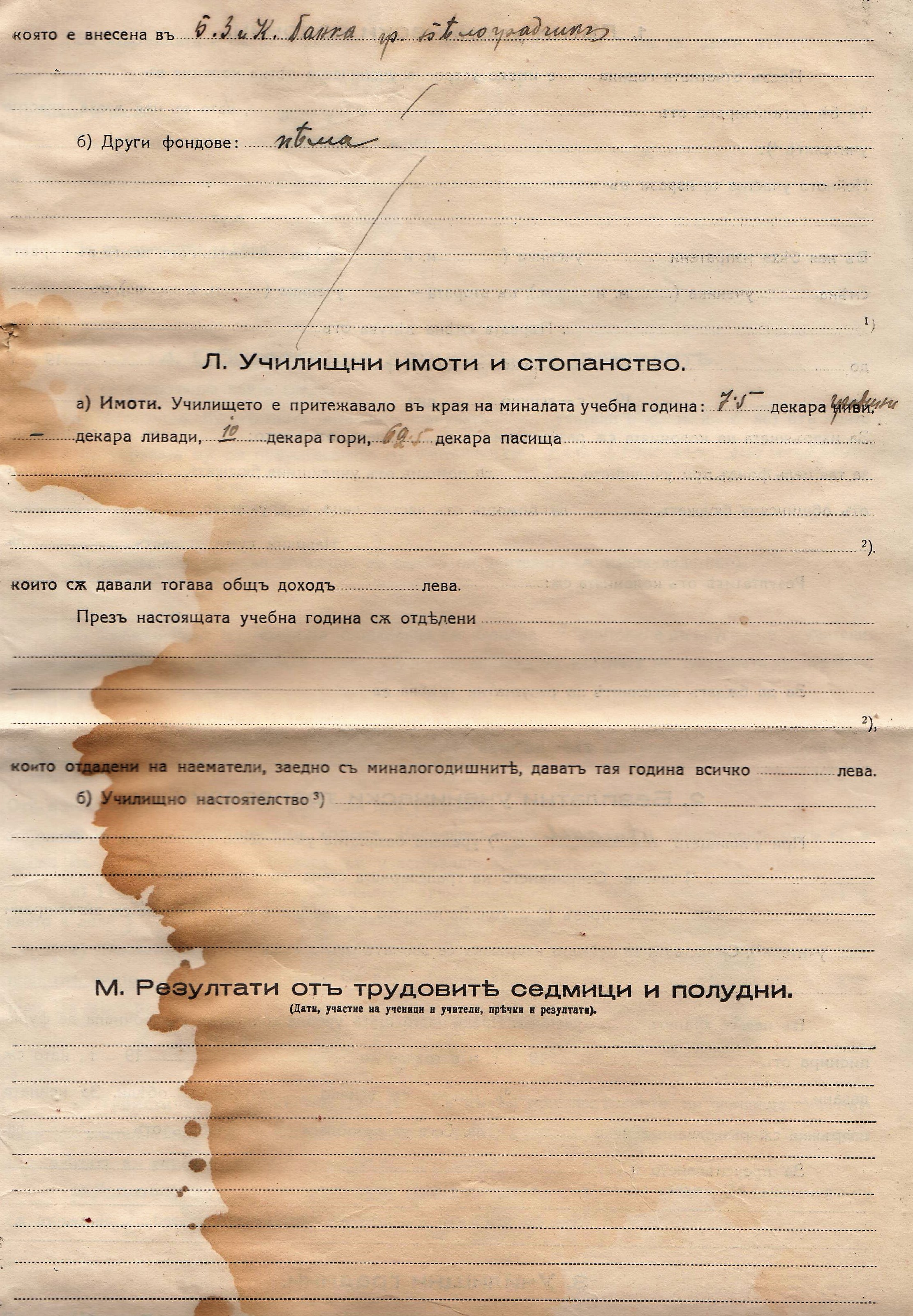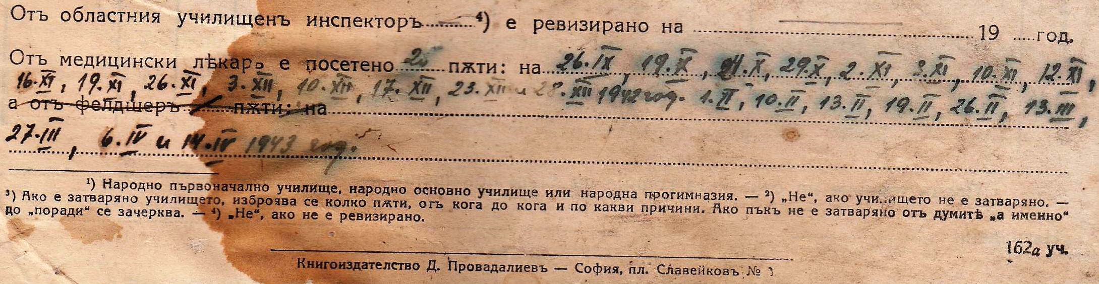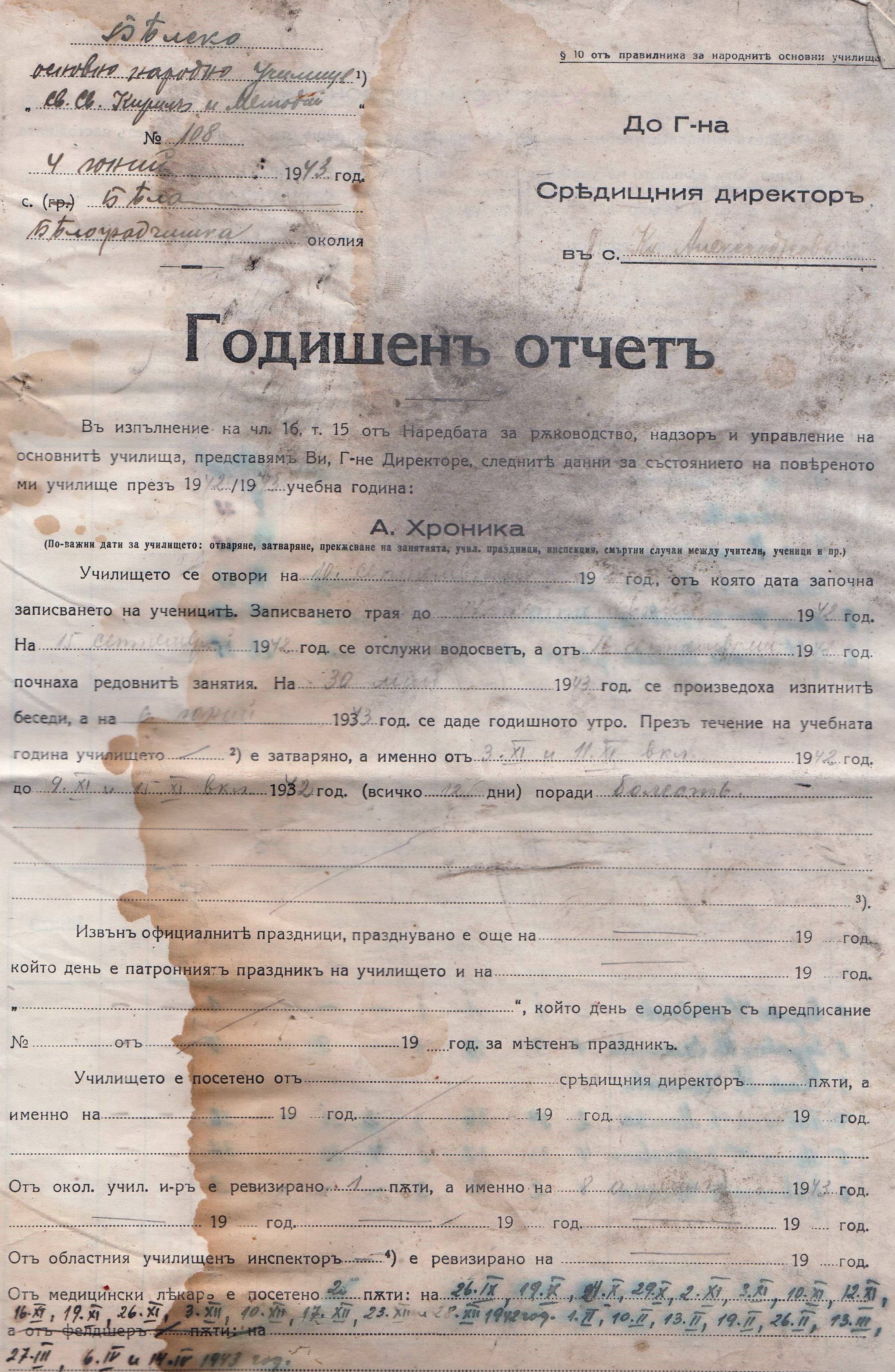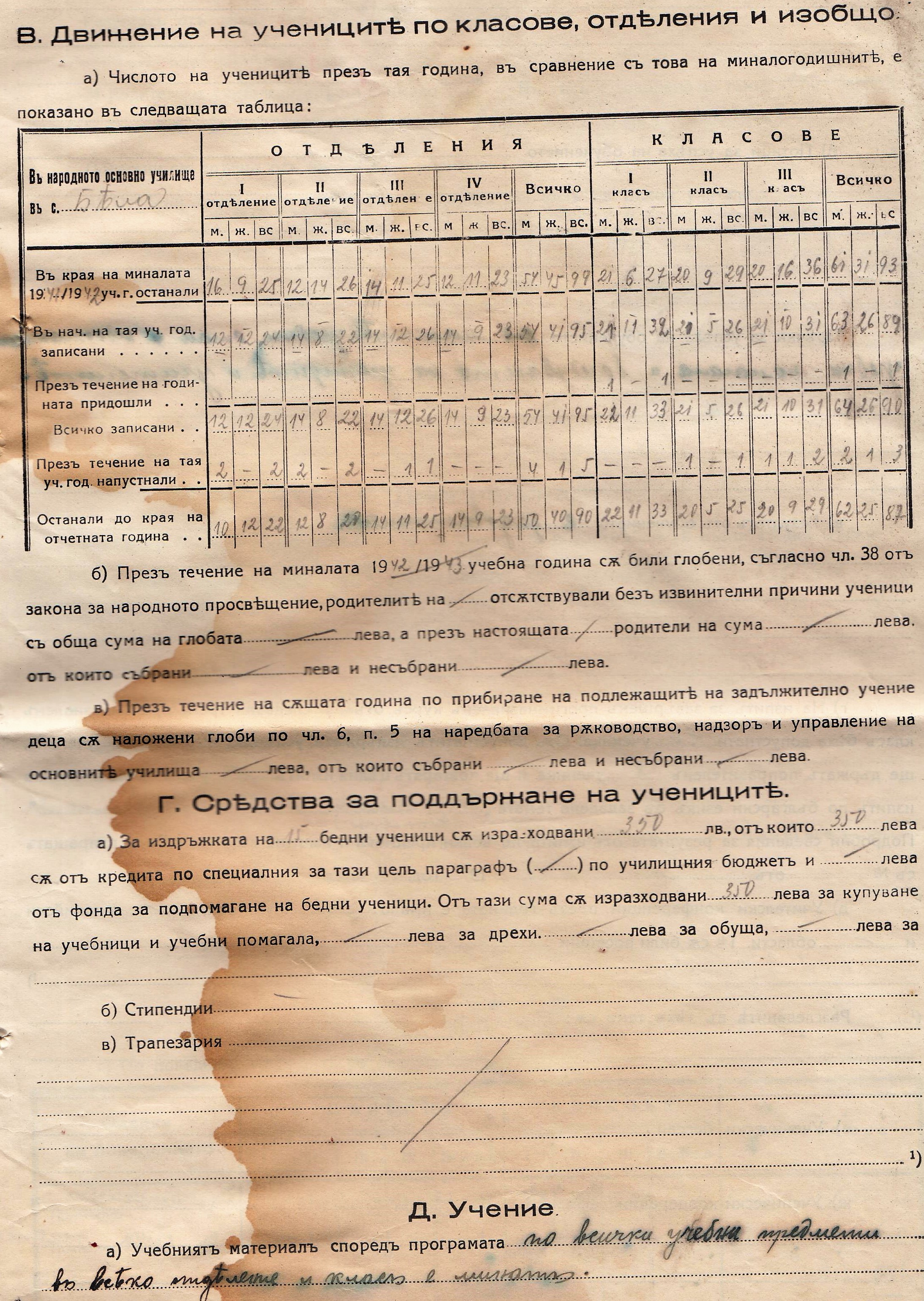 Училището се отвори на 10 Септември 1942 г. от която дата започна записването на учениците. Записването трая до 14 Септември 1943 г. На 15 Септември се отслужи водосвет, а от 16 Септември почнаха редовните занятия. На 39 Май 1943 г. се произведоха годишните беседи , а на 6 Юни се даде годишно утро. През учебната година училището не е затваряно 3.11. и 11.11.1942 г. до 9.11. и 15.11.1942 г. всичко 12 дни по болест.Околийския училищен инспектор е посетил училището на 8 Април 1943 г. От медицинския лекар е посетено 2 пъти , а от фелдшера многократно.