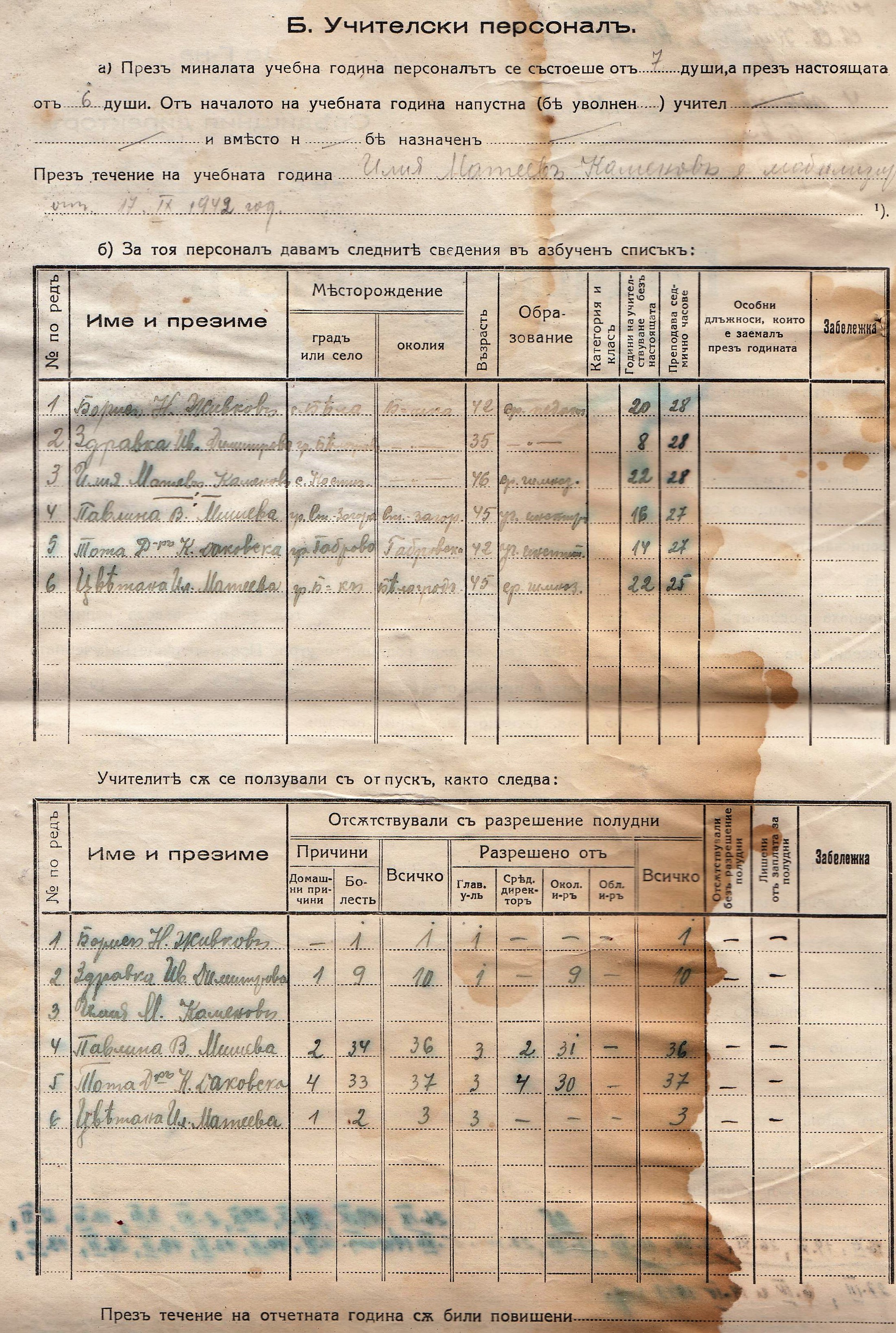 През миналата учебна година персоналът се състоеше от 7 души, а през настоящата от 6 души.. През течение на учебната година Илия Матеев Каменов е мобилизиран от 17.09.1942 година.
