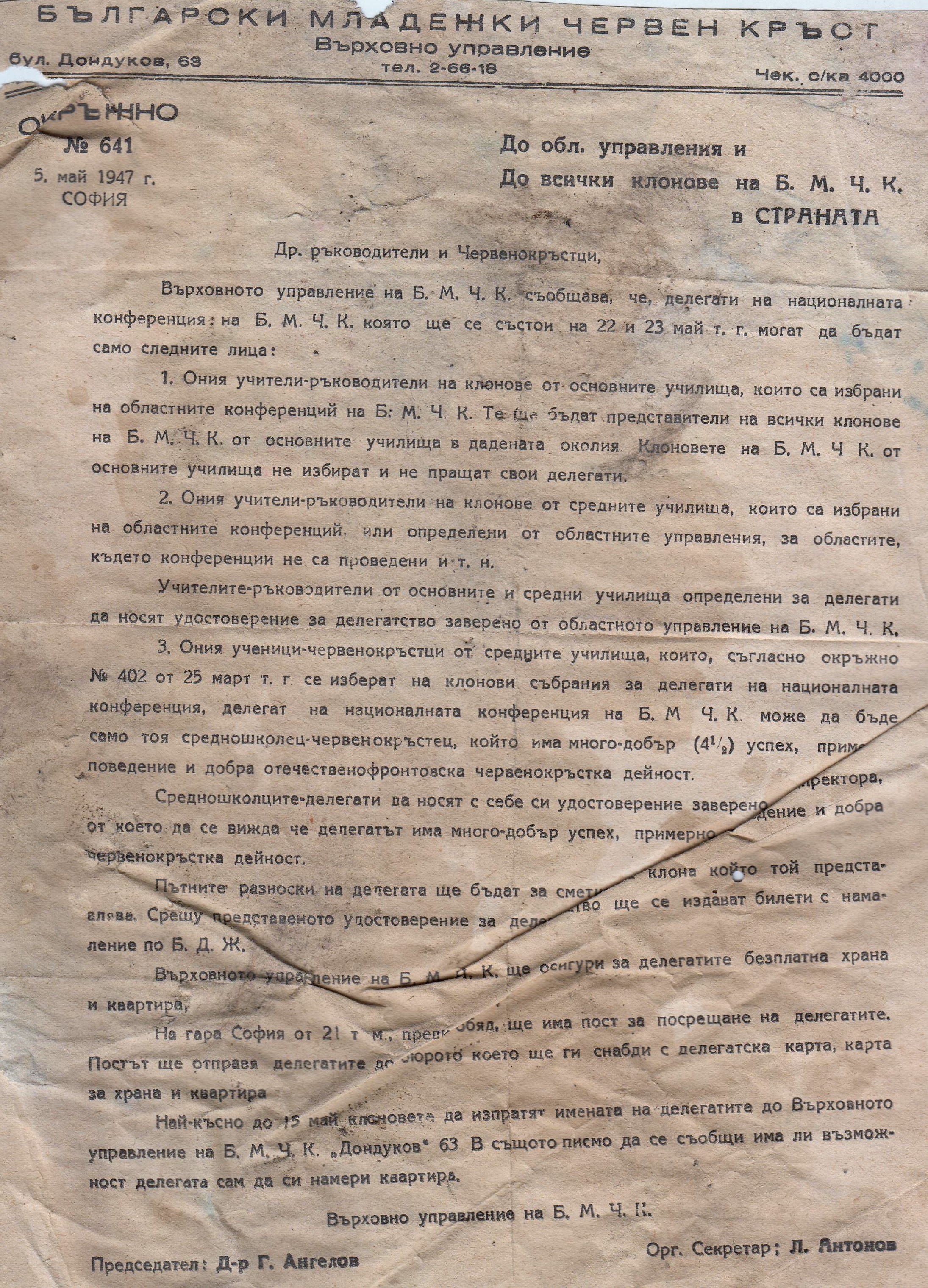 Един документ до ръководителя на младежкия Червен Кръст в село Бела – 1947 година .