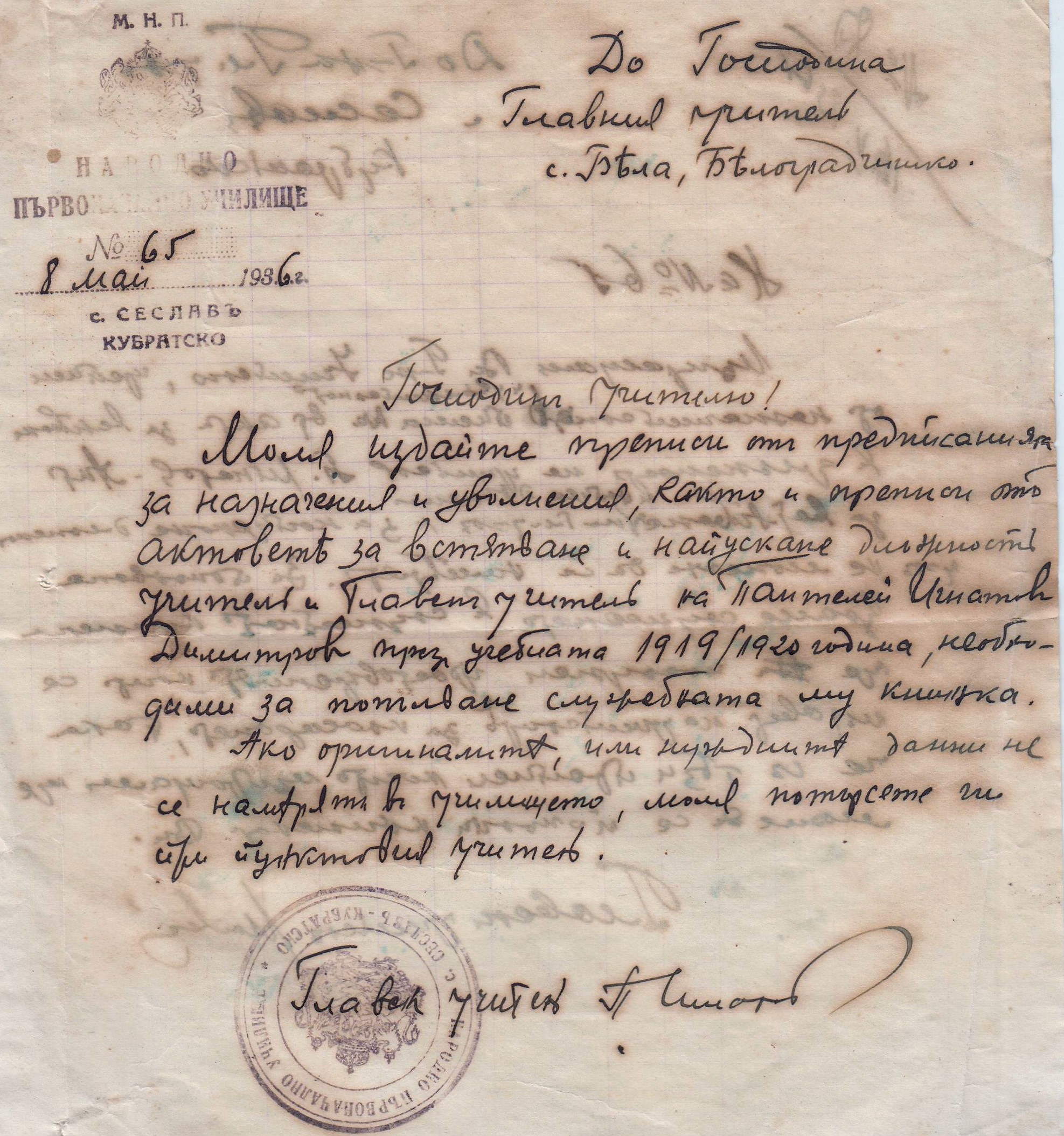 Следа за учителя Панталей Игнатов Димитров, който е бил учител в село Бела 1921/22 г. , а сега 1936 година е Главен учител в село Сеславци , Кубратско.